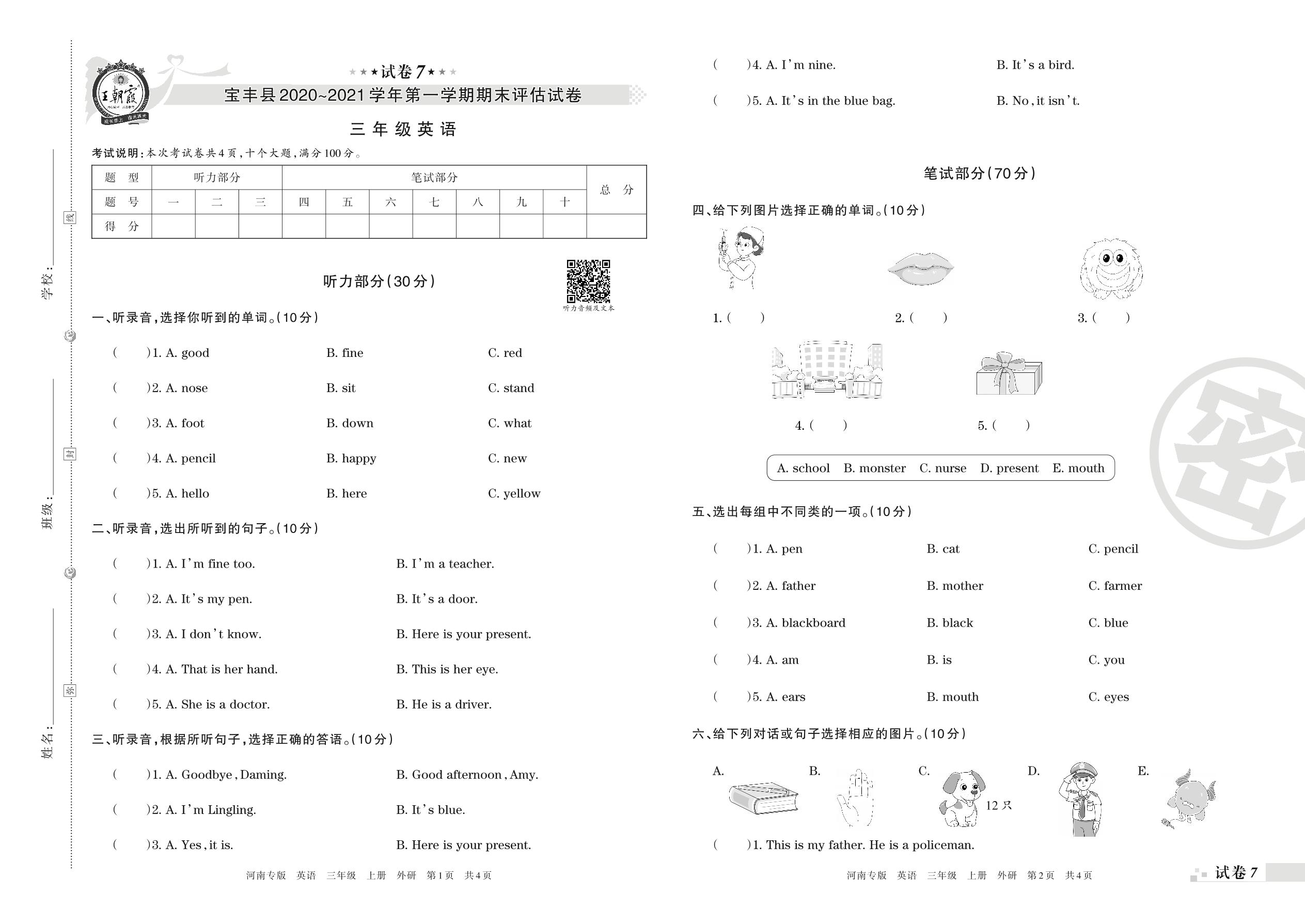 宝丰县2020~2021学年第一学期期末评估试卷三年级英语(外研版)【7】