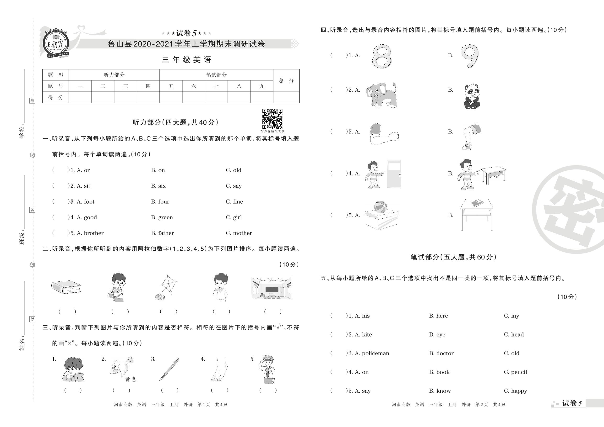 鲁山县2020~2021学年上学期期末调研试卷三年级英语(外研版)【5】