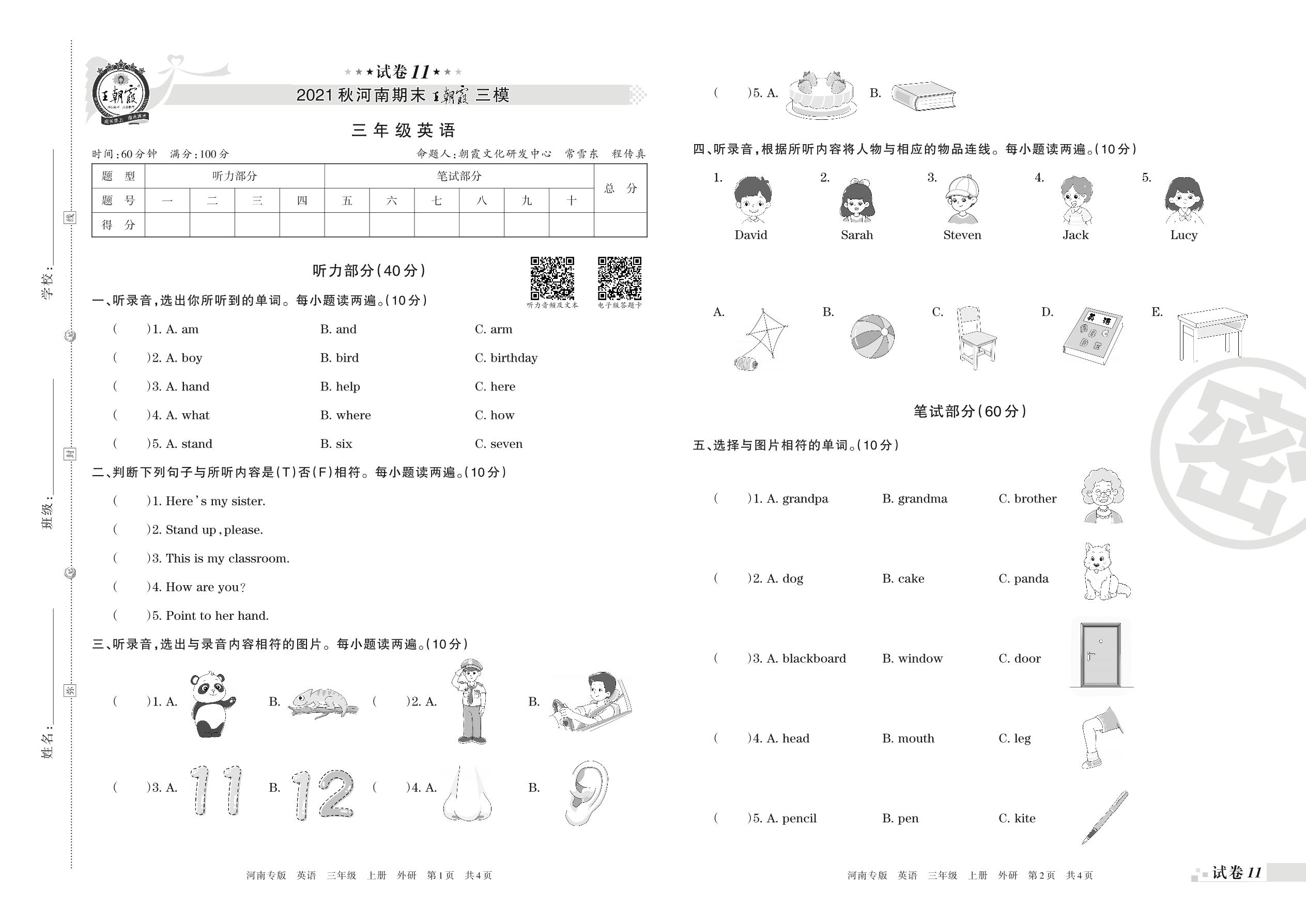 王朝霞期末模拟卷三年级上册英语(外研版)【11】