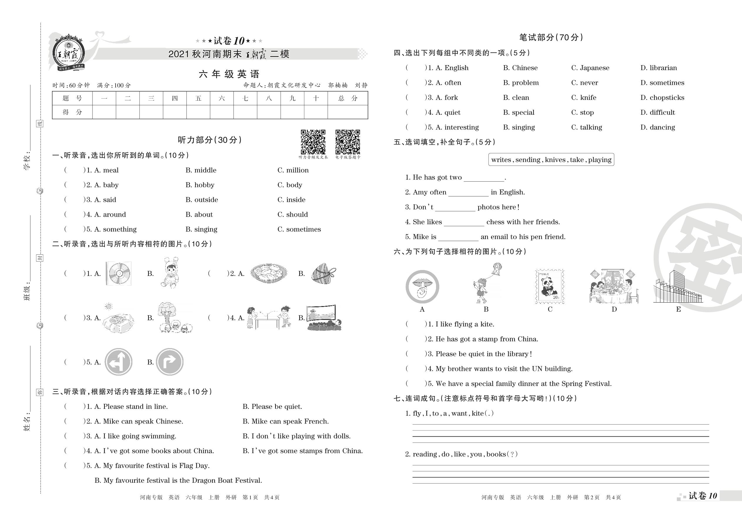 王朝霞期末模拟卷六年级上册英语(外研版)_R211225151328695【10】