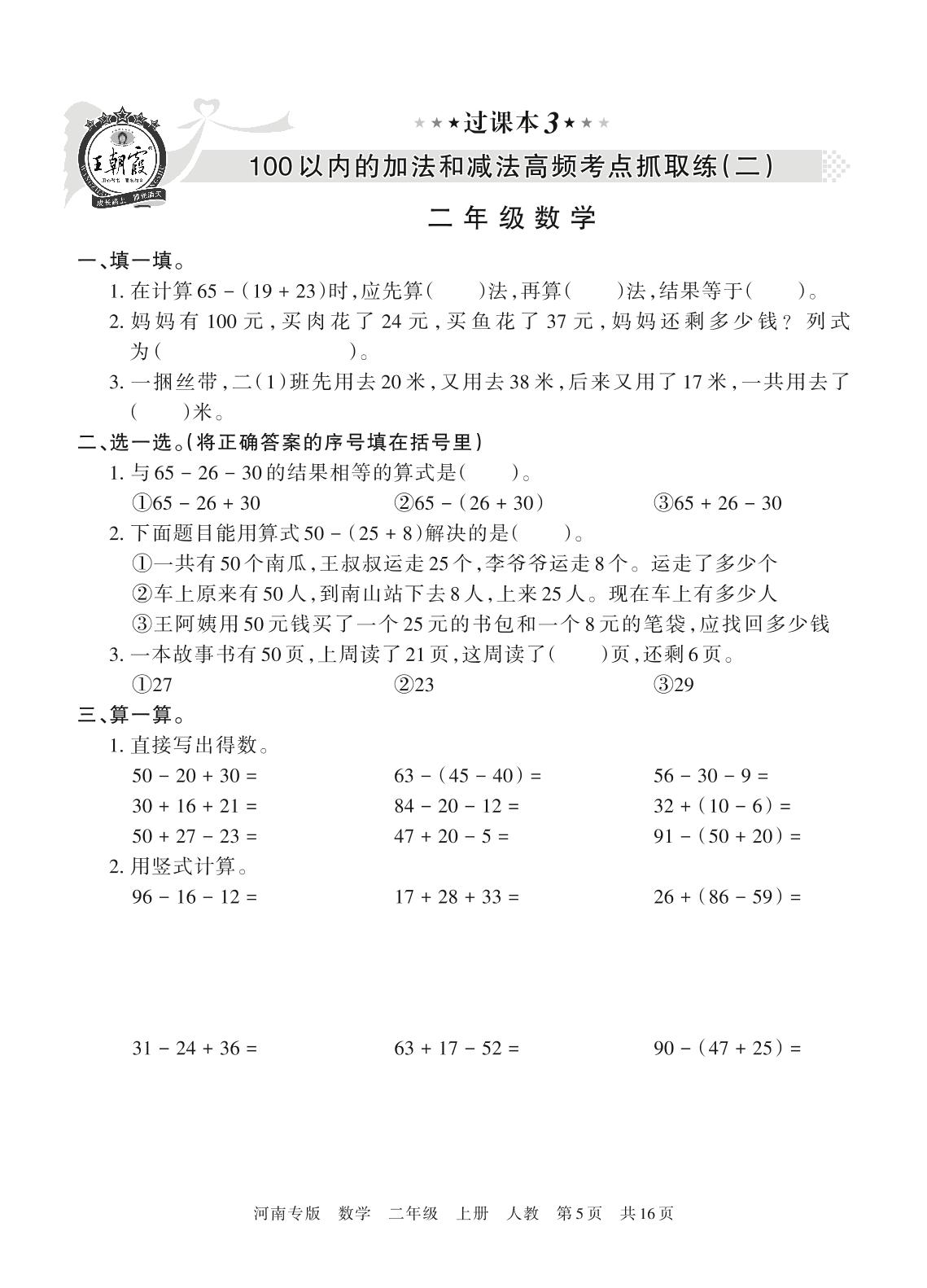 王朝霞期末过课本——100以内的加法和减法高频考点抓取练(二)二年级上册数学(人教版)_R211225152756134【3】