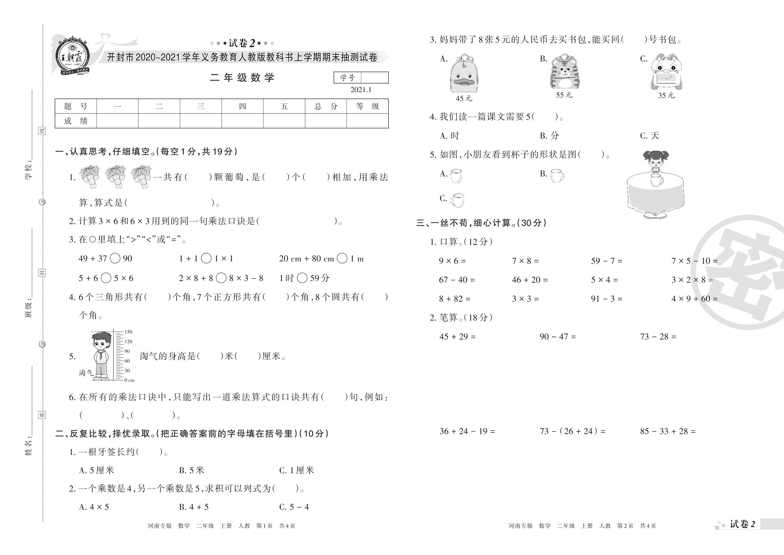 开封市2020~2021学年义务教育人教版教科书上学期期末抽测试卷二年级数学人教版_R211225152757036【2】