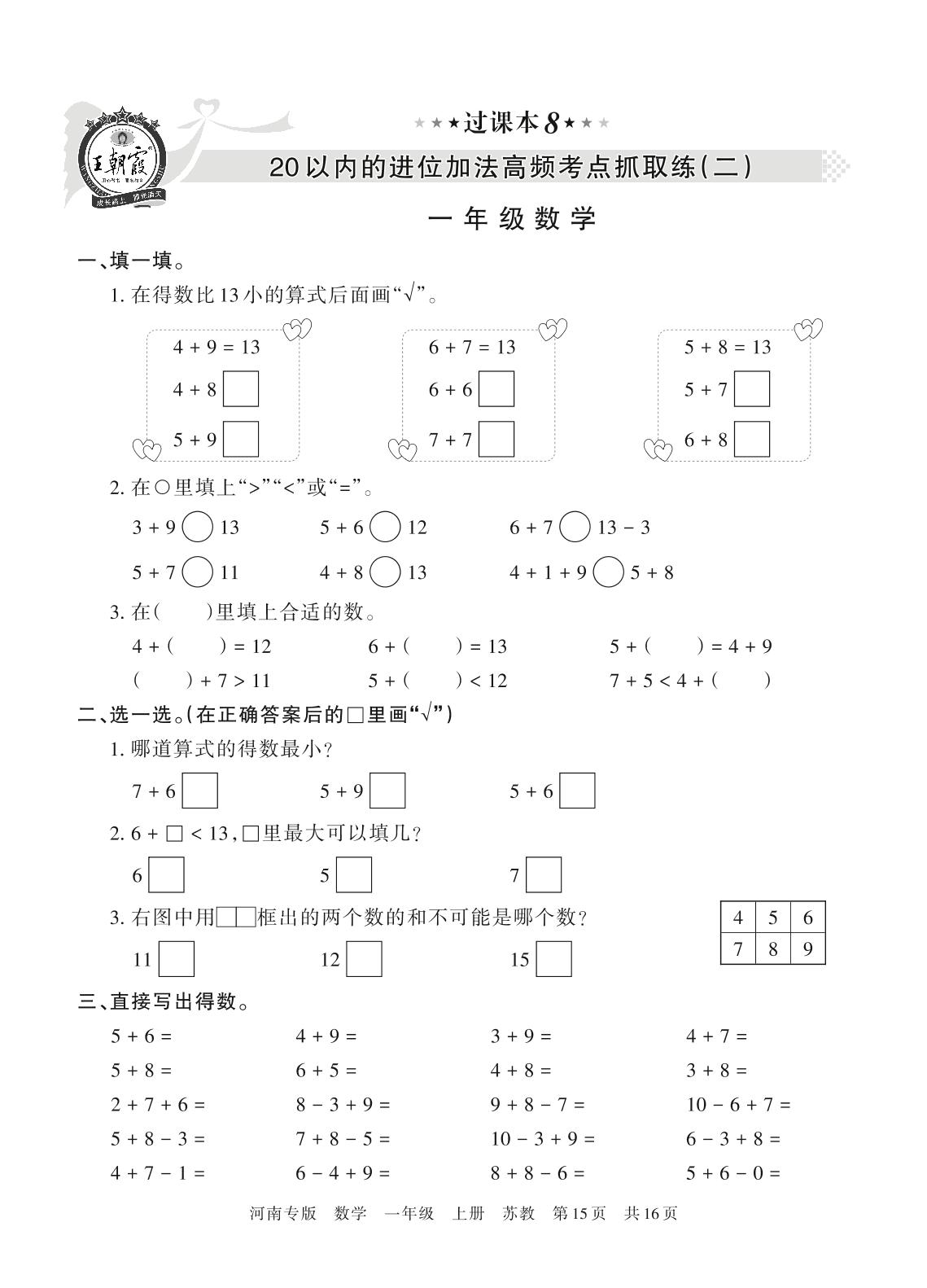 王朝霞期末过课本——20以内的进位加法高频考点抓取练(二)一年级上册数学(苏教版)_R211225152839459【8】