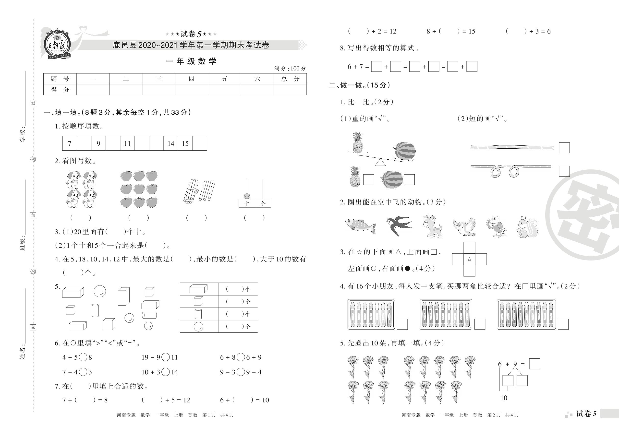 鹿邑县2020~2021学年第一学期期末考试卷一年级数学(苏教版)【5】
