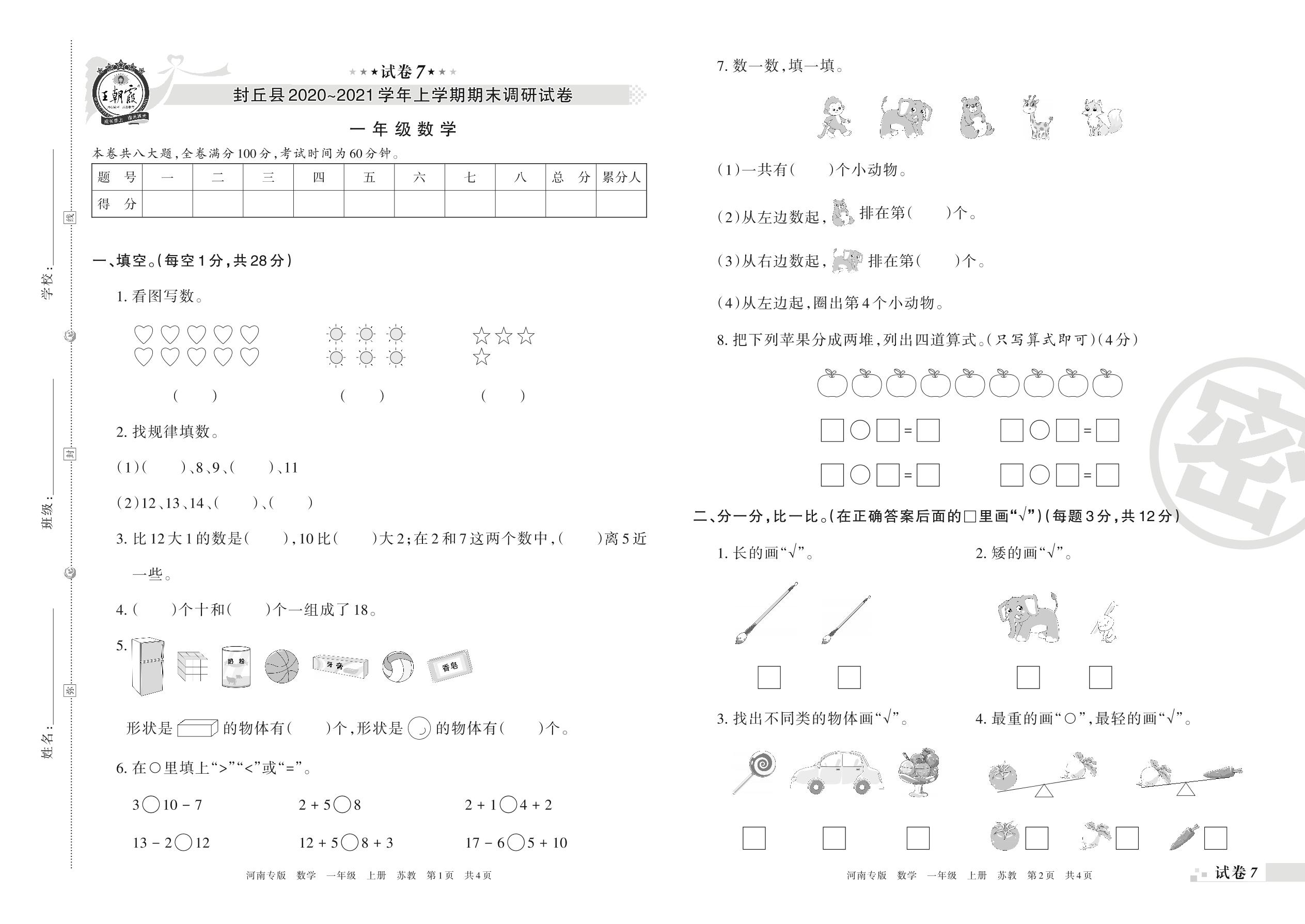 封丘县2020~2021学年上学期期末调研试卷一年级数学(苏教版)【7】