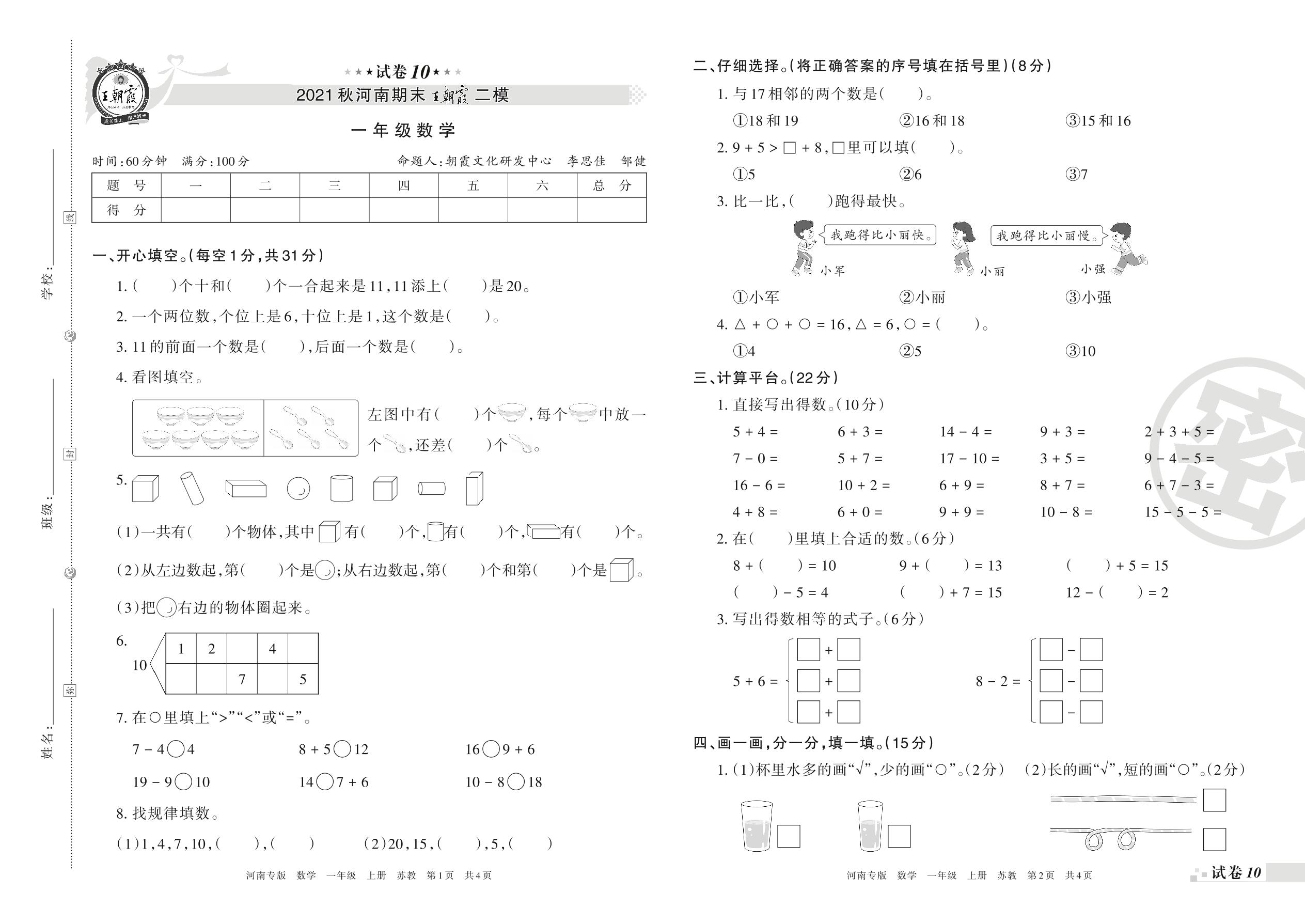 王朝霞期末模拟卷一年级上册数学(苏教版)_R211225152840822【10】