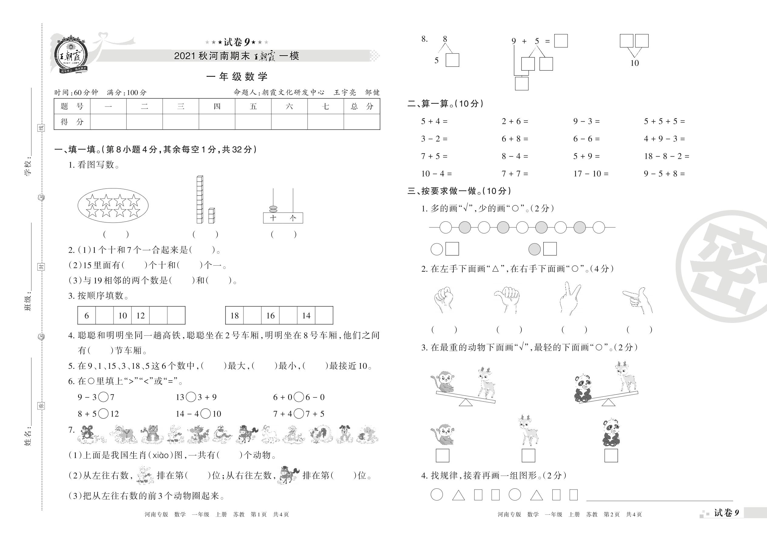 王朝霞期末模拟卷一年级上册数学(苏教版)_R211225152840033【9】