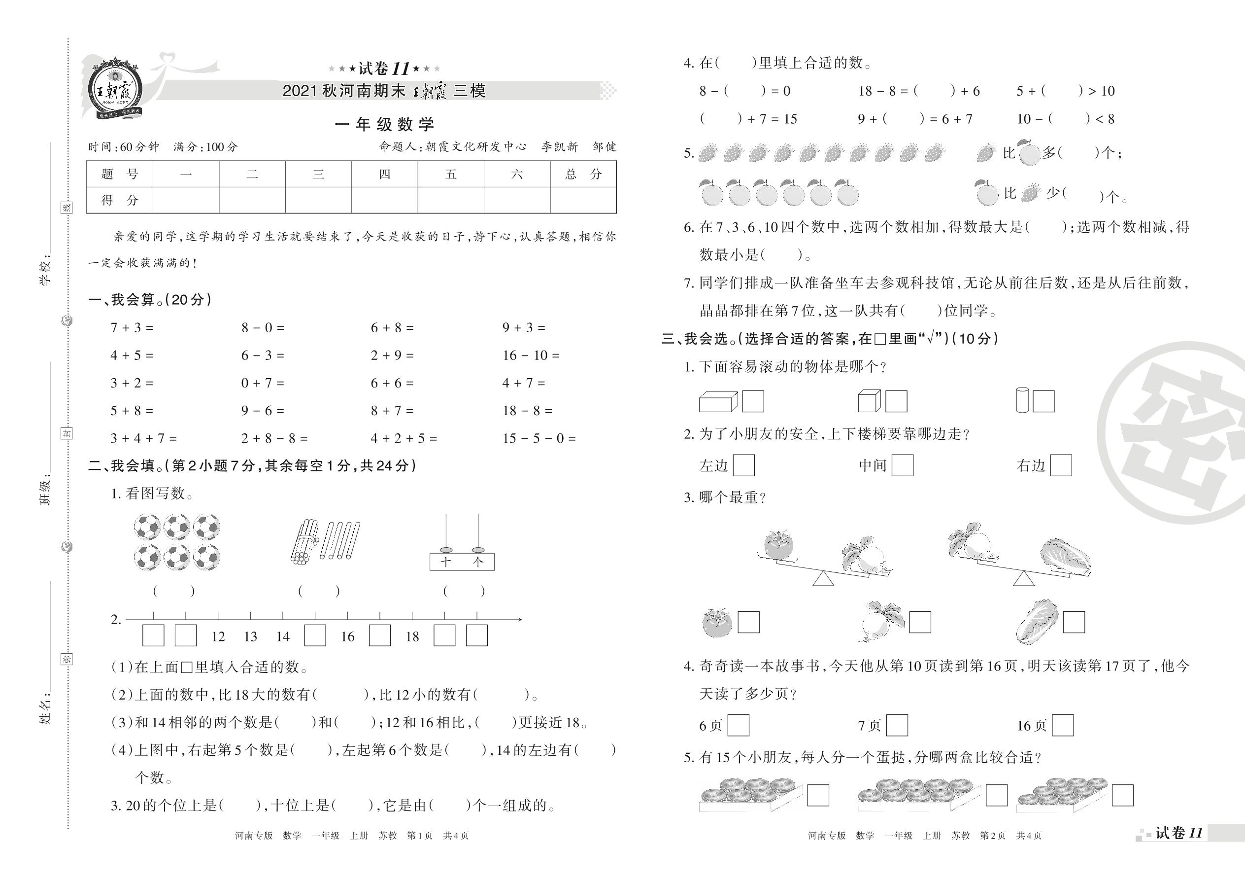 王朝霞期末模拟卷一年级上册数学(苏教版)【11】
