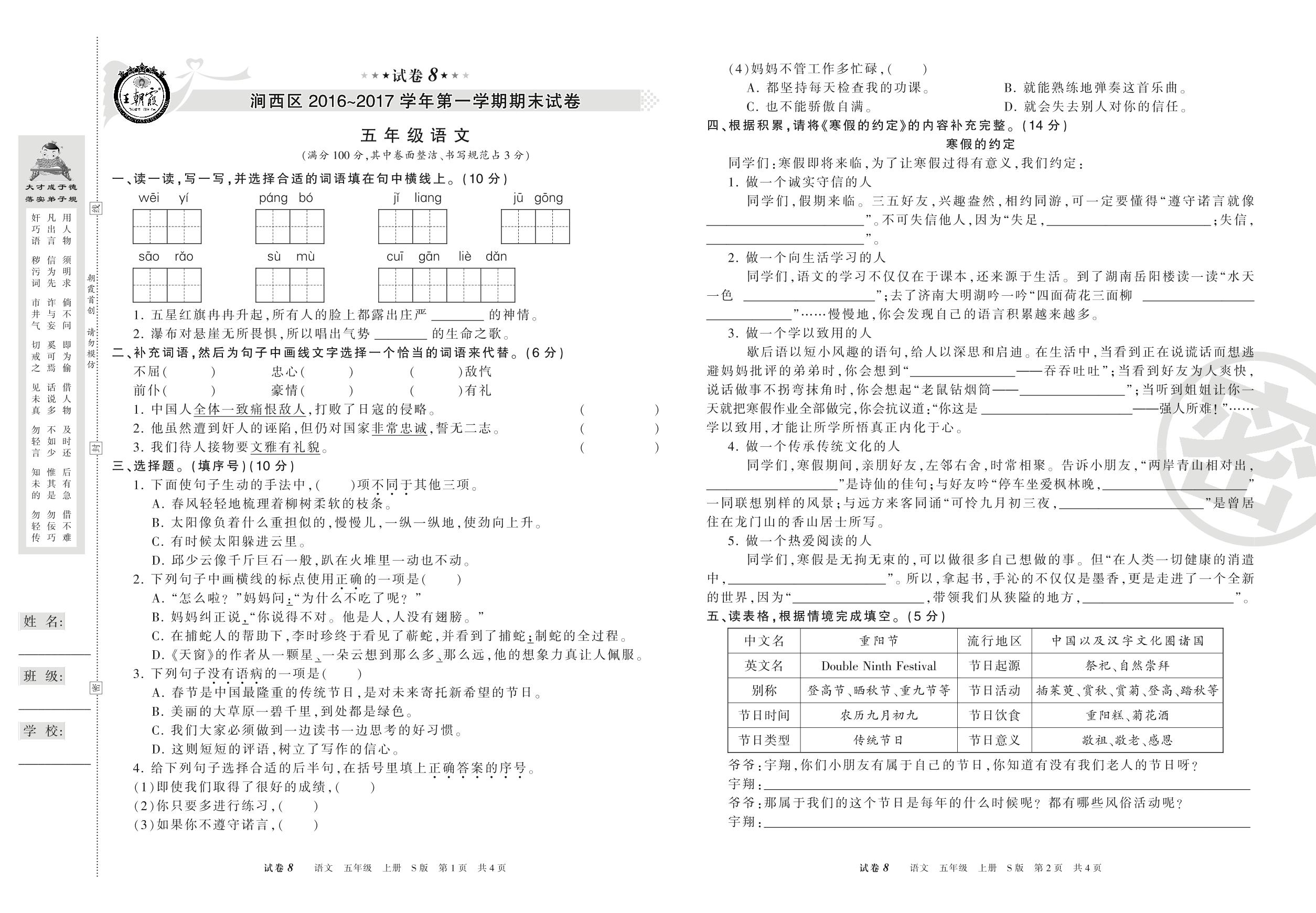 2016-2017学年第一学期洛阳市涧西区五年级语文试卷(S版)【8】