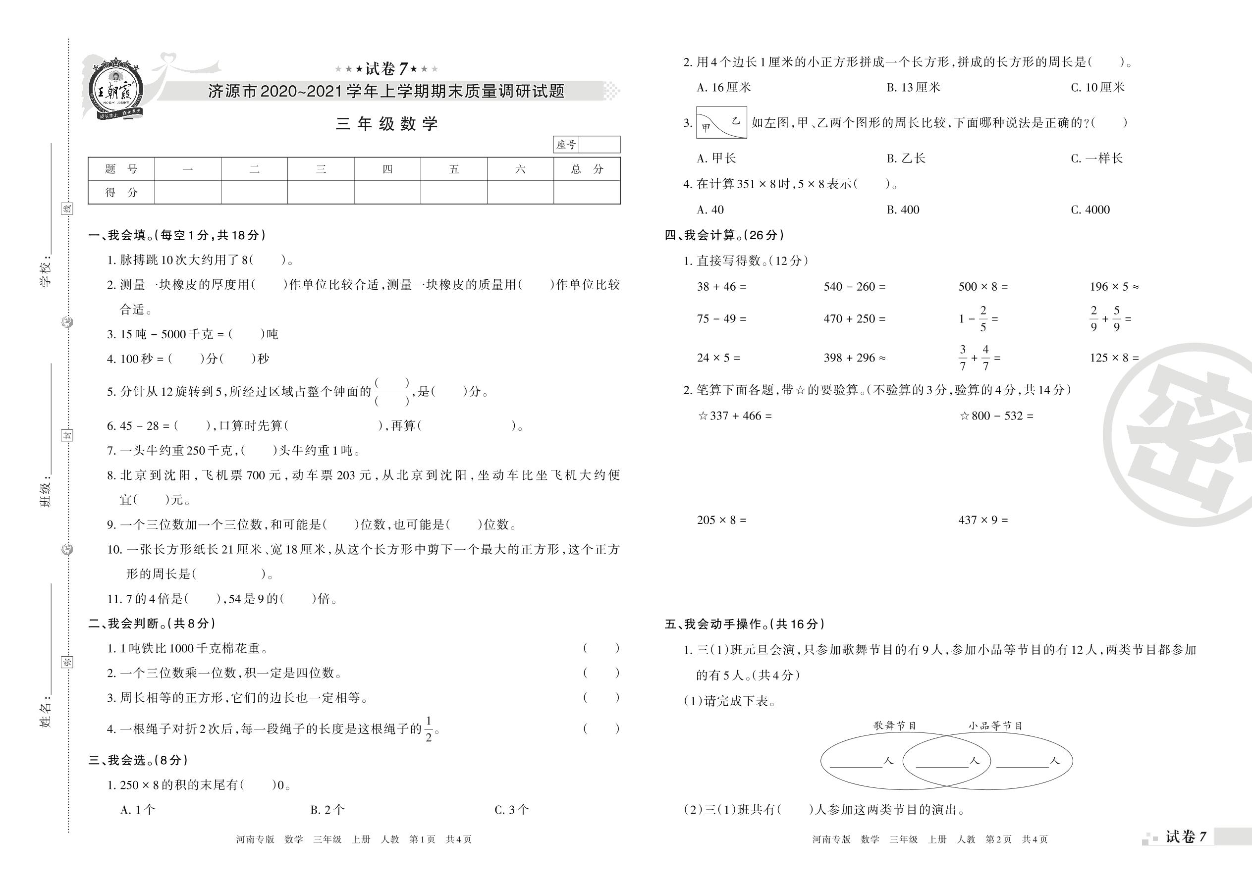 济源市2020~2021学年上学期期末质量调研试题三年级数学人教版【7】