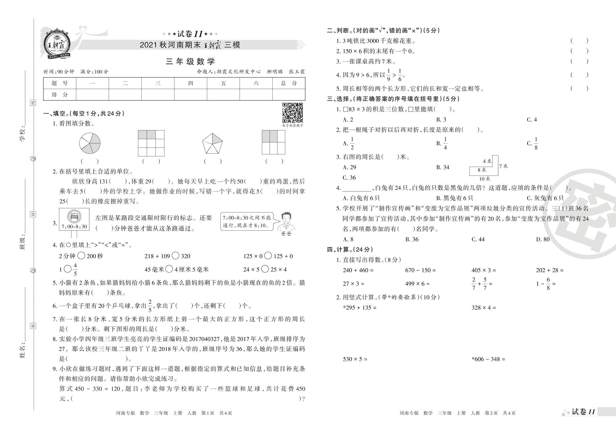 王朝霞期末模拟卷三年级上册数学(人教版)_R211225153656039【11】