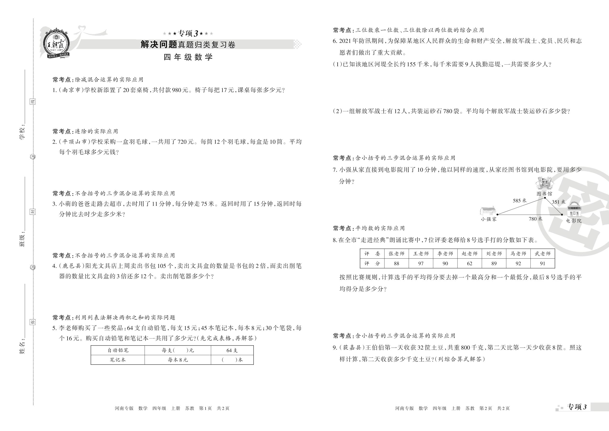 王朝霞期末专项卷——解决问题真题归类复习卷四年级上册数学(苏教版)_R211225153820310【3】