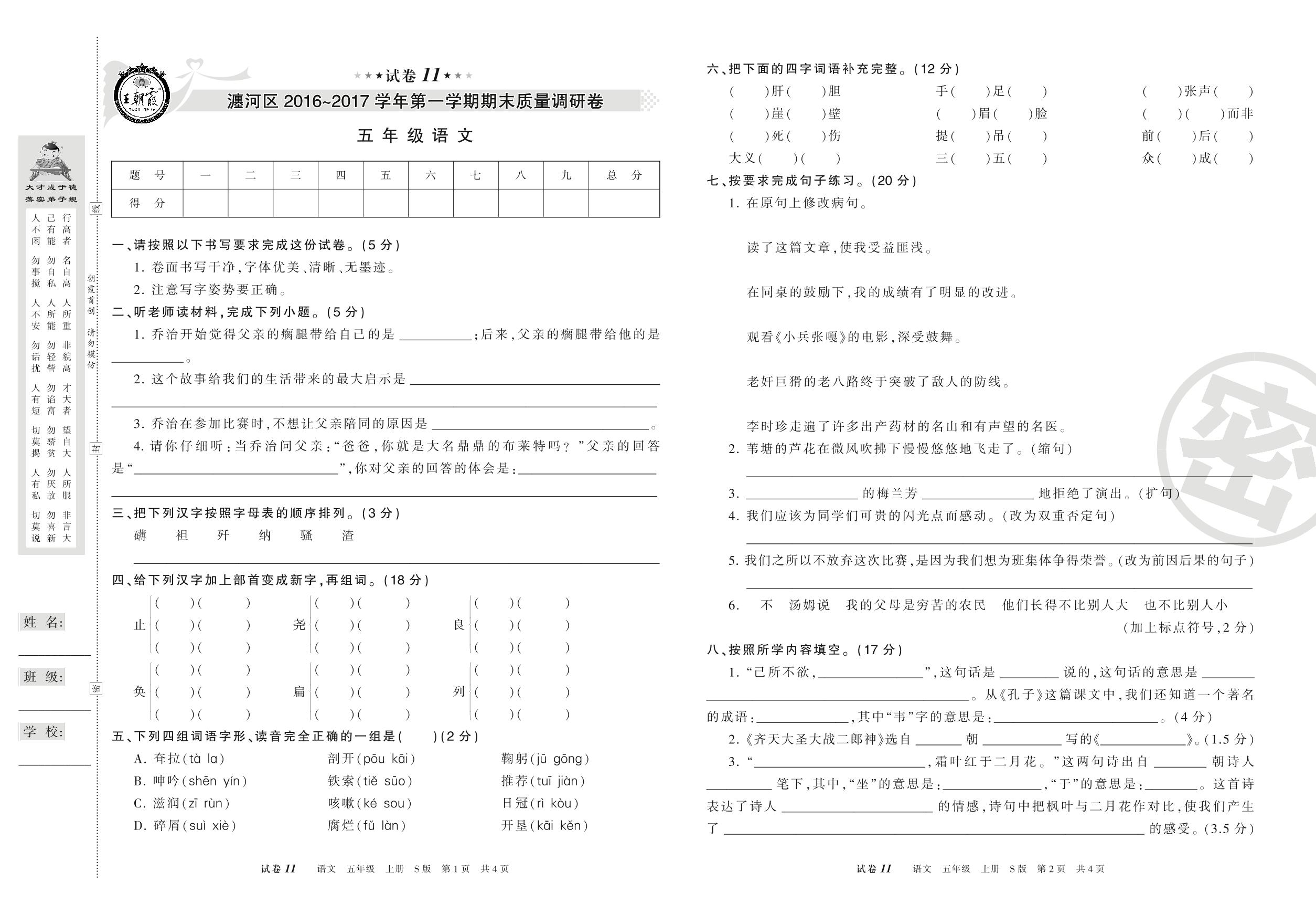 2016-2017学年第一学期洛阳市瀍河区五年级语文试卷(S版)【11】