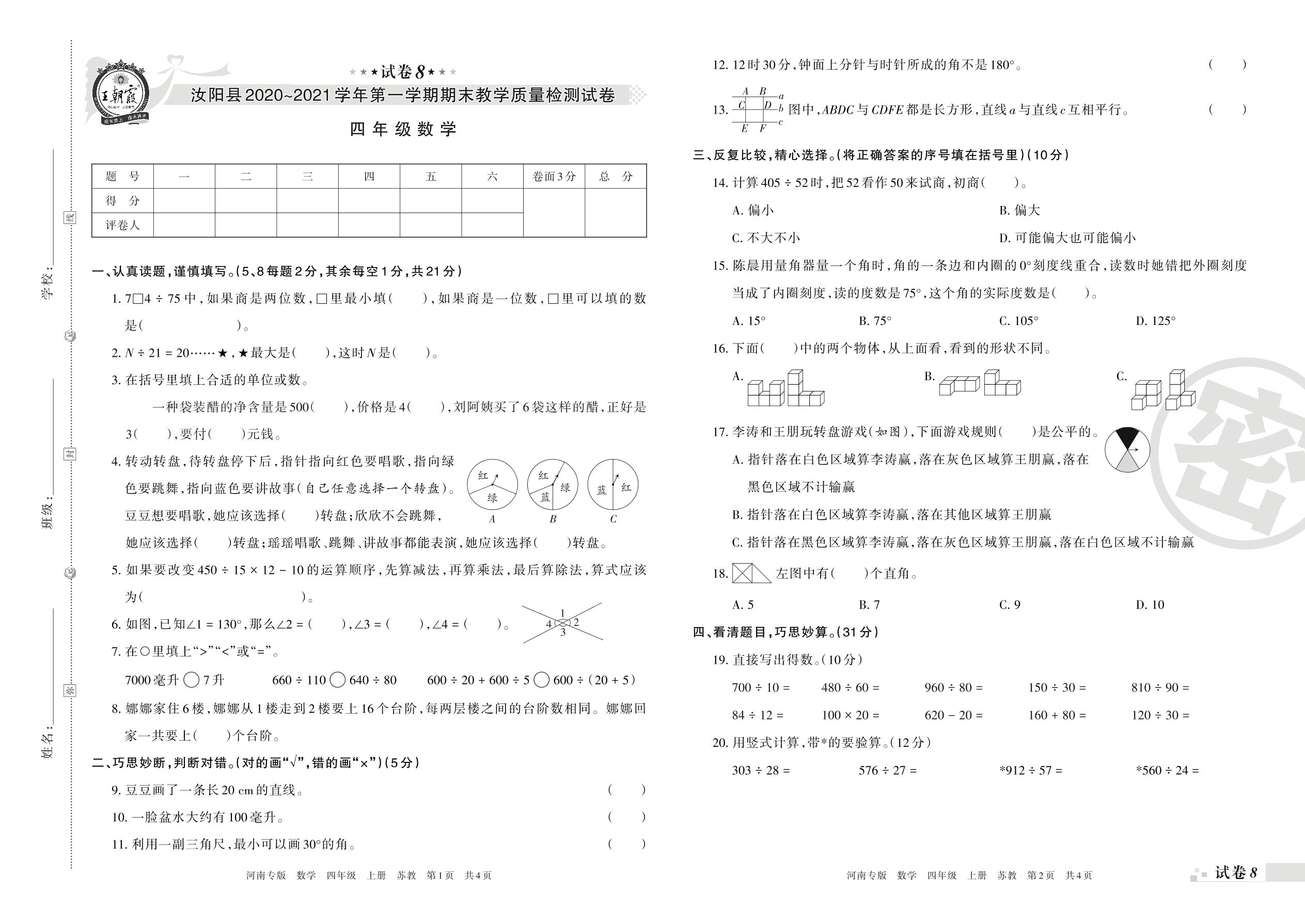 汝阳县2020~2021学年第一学期期末教学质量检测试卷四年级数学(苏教版)【8】