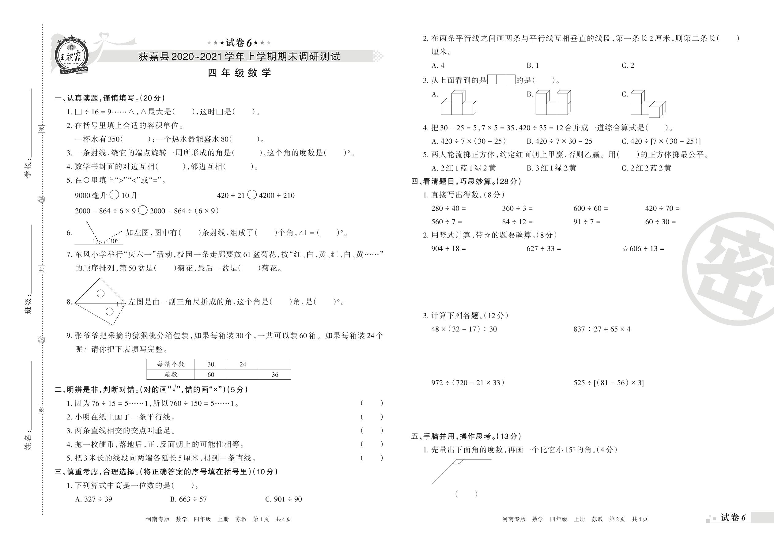 获嘉县2020~2021学年上学期期末调研测试四年级数学(苏教版)【6】