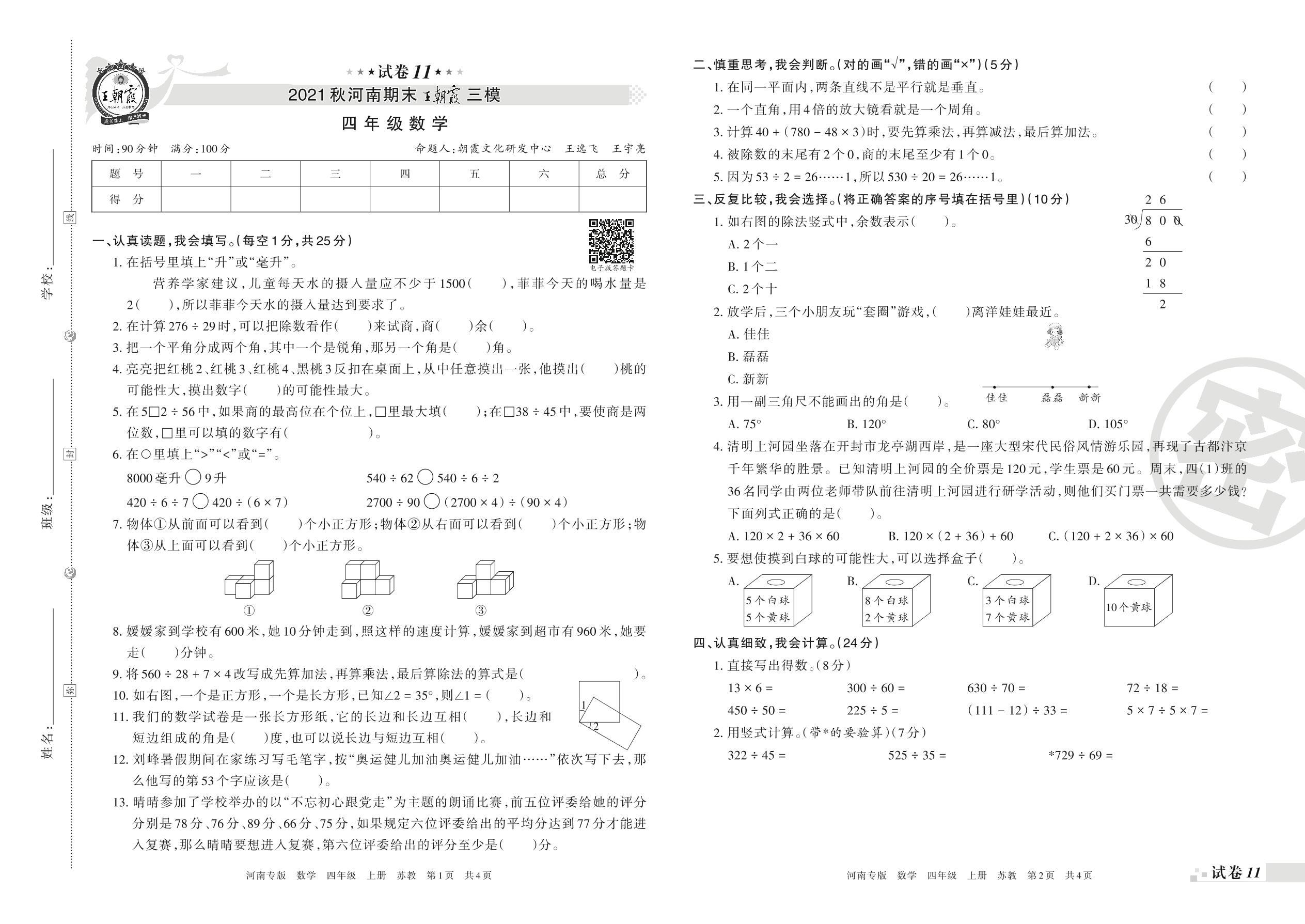 王朝霞期末模拟卷四年级上册数学(苏教版)【11】