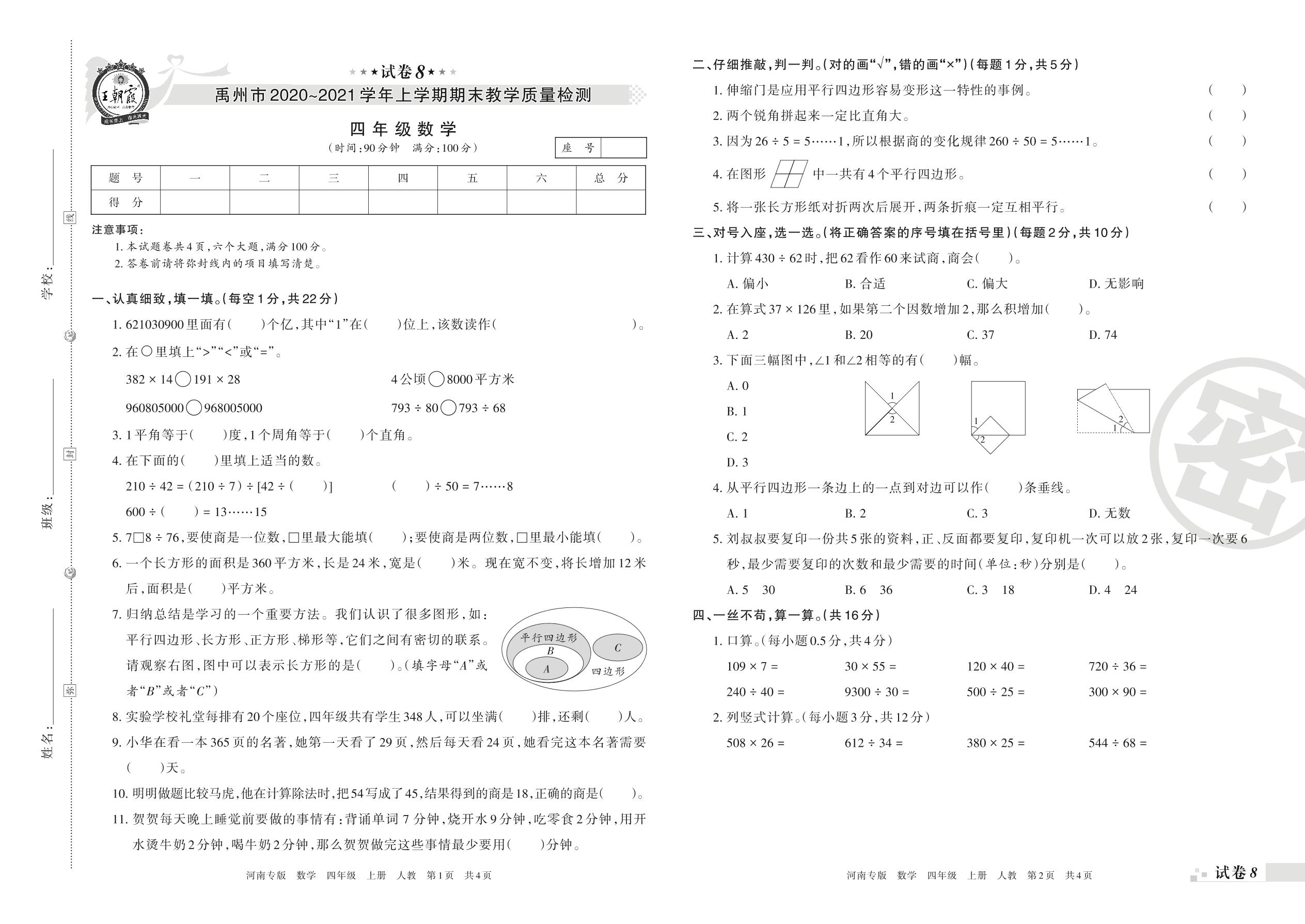 禹州市2020~2021学年上学期期末教学质量检测四年级数学(人教版)【8】
