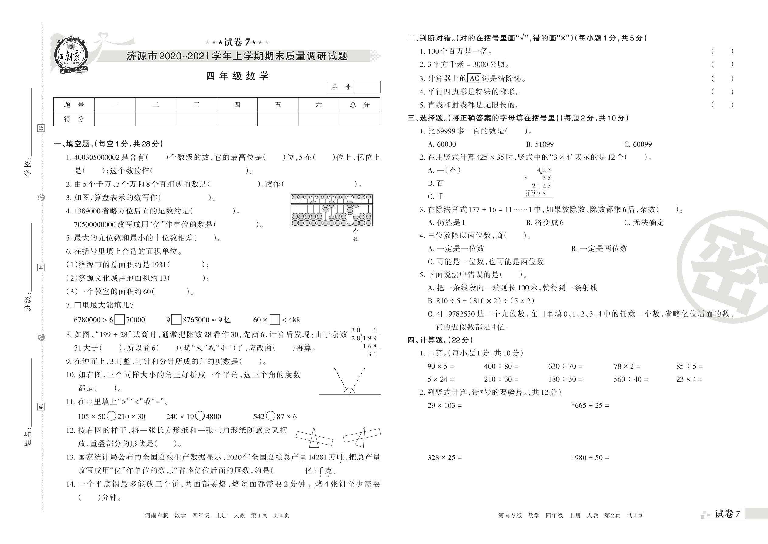 济源市2020~2021学年上学期期末质量调研试题四年级数学(人教版)【7】