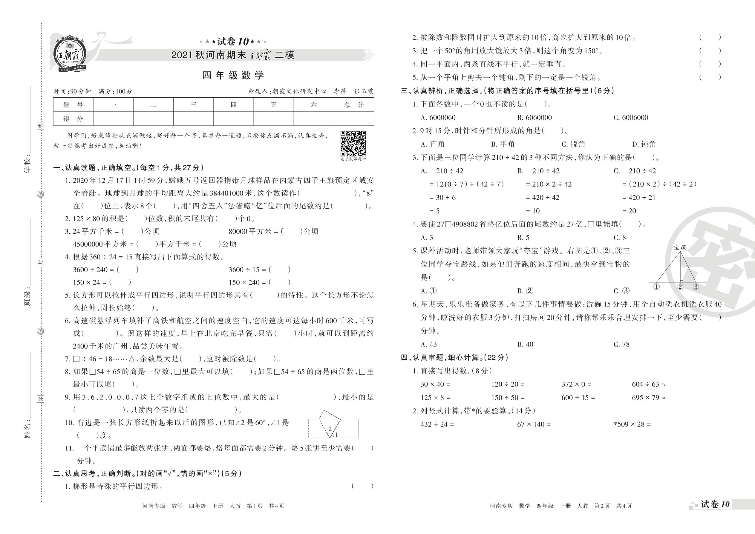 王朝霞期末模拟卷四年级上册数学(人教版)_R211225154130895【10】