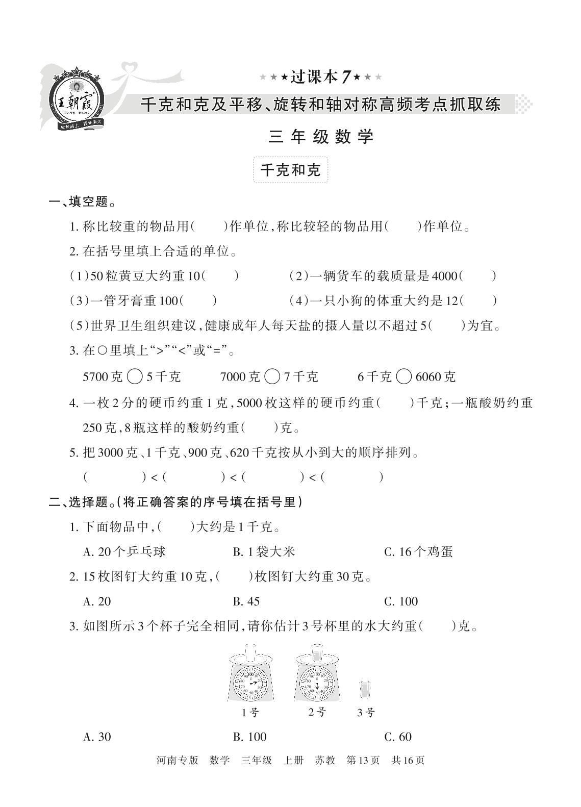 王朝霞期末过课本——千克和克及平移、旋转和轴对称高频考点抓取练三年级上册数学(苏教版)_R211225154343479【7】