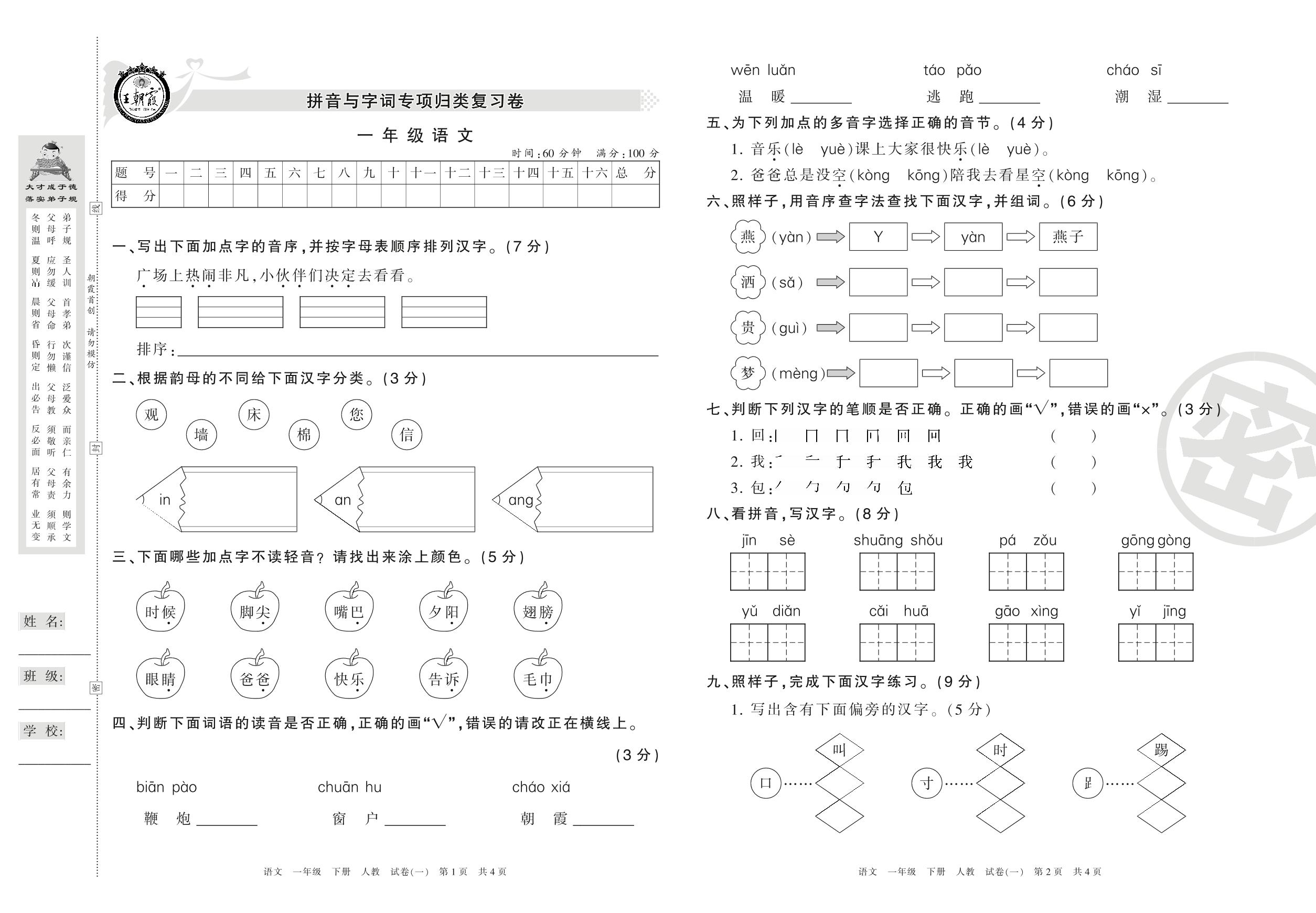 王朝霞期末专项卷一年级下册语文(人教版)_R210731182217【1】