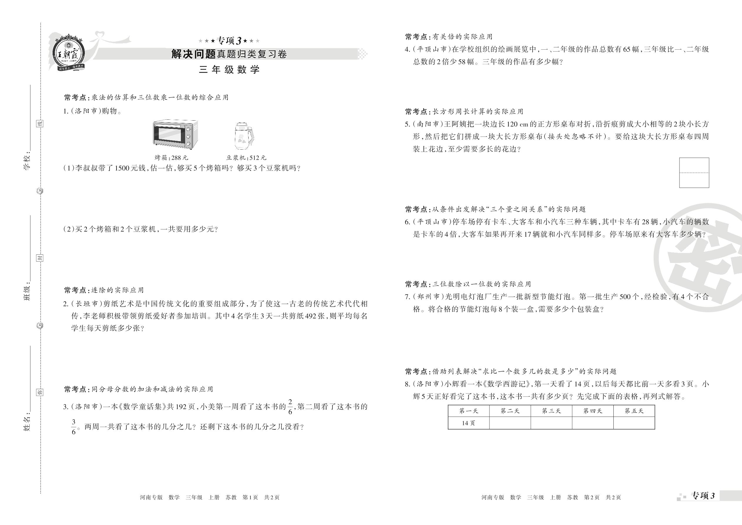 王朝霞期末专项卷——解决问题真题归类复习卷三年级上册数学(苏教版)_R211225154344891【3】