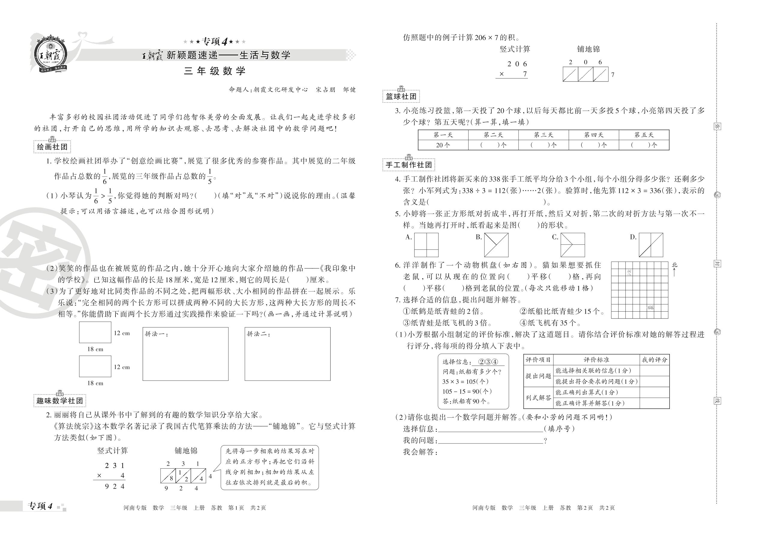 王朝霞期末专项卷——新颖题速递:生活与数学三年级上册数学(苏教版)_R211225154344067【4】