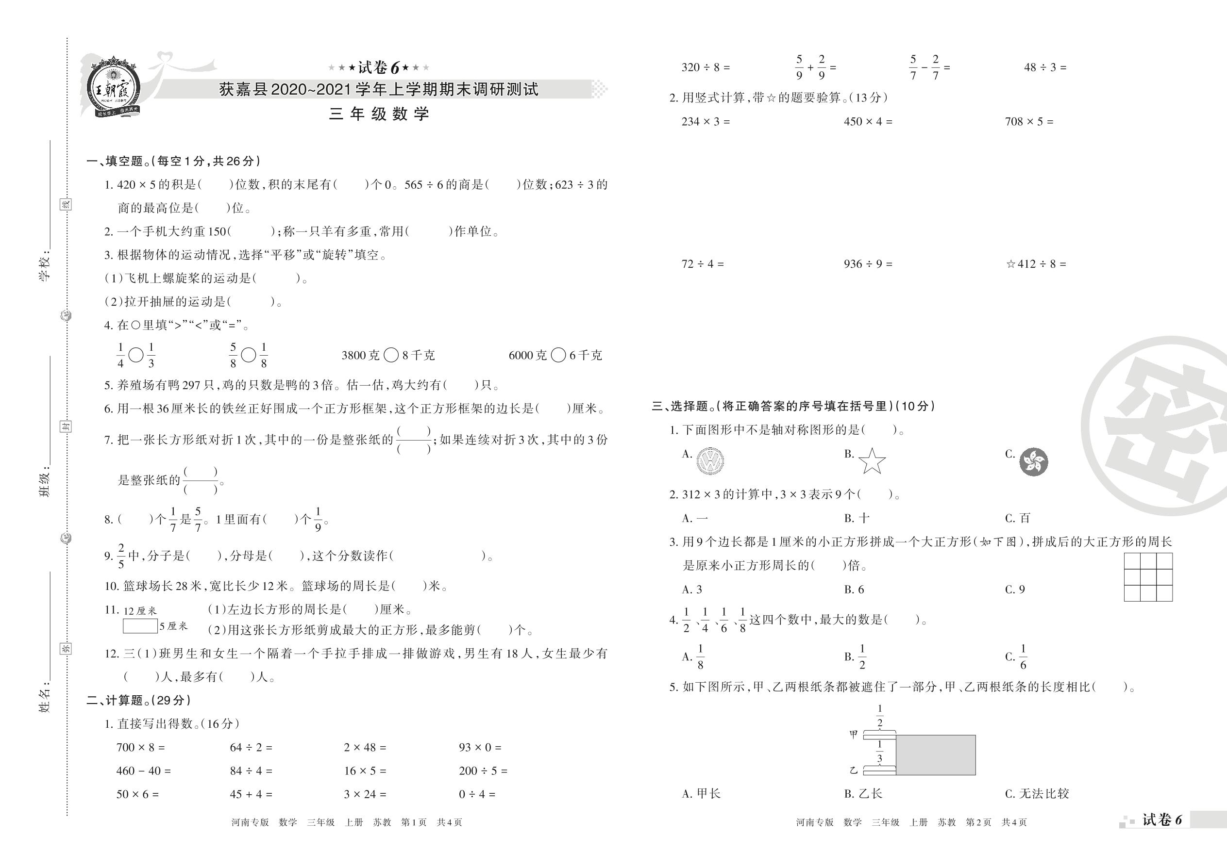 获嘉县2020~2021学年上学期期末调研测试三年级数学(苏教版)【6】
