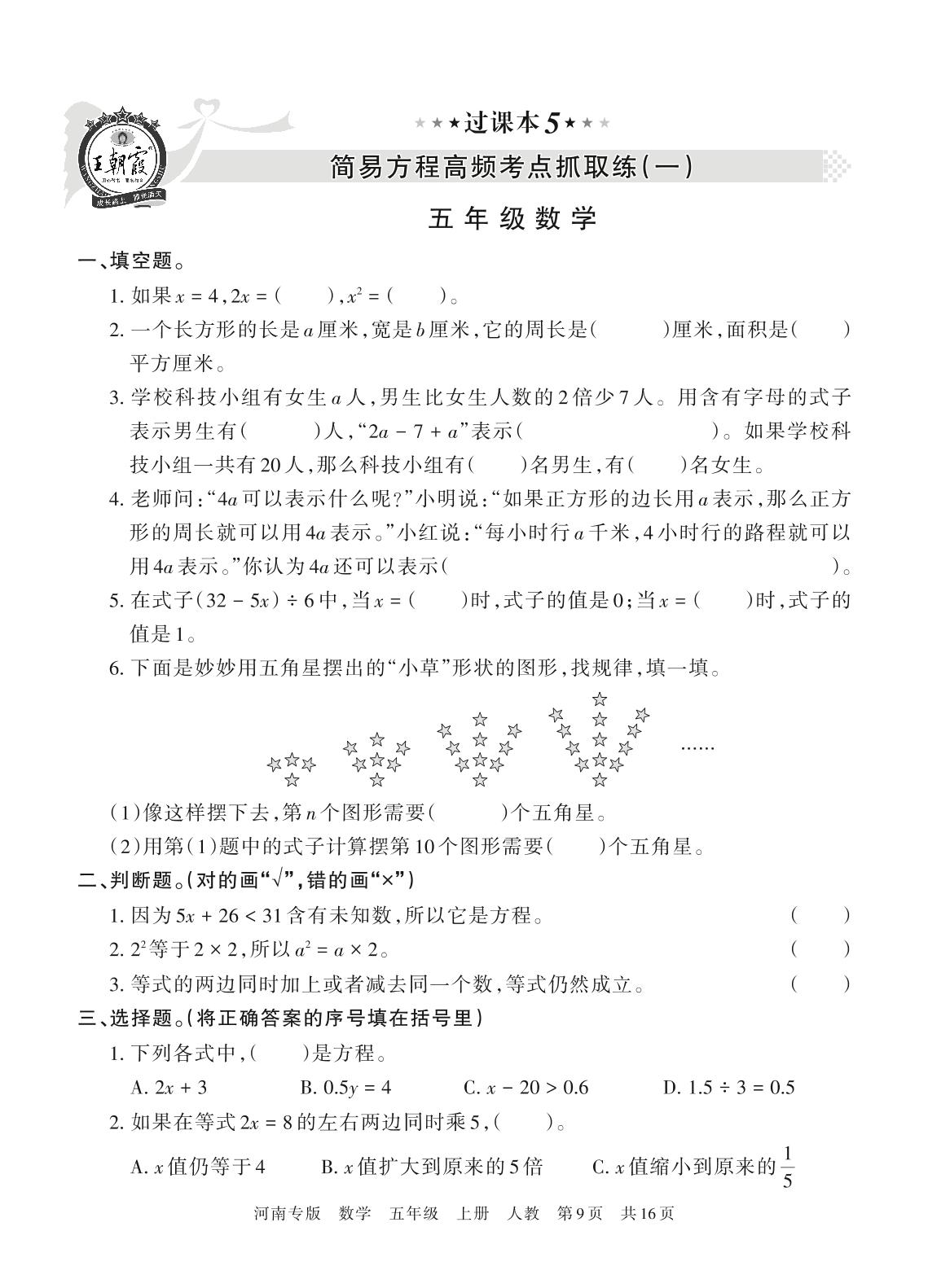王朝霞期末过课本——简易方程高频考点抓取练(一)五年级上册数学(人教版)_R211225154624739【5】