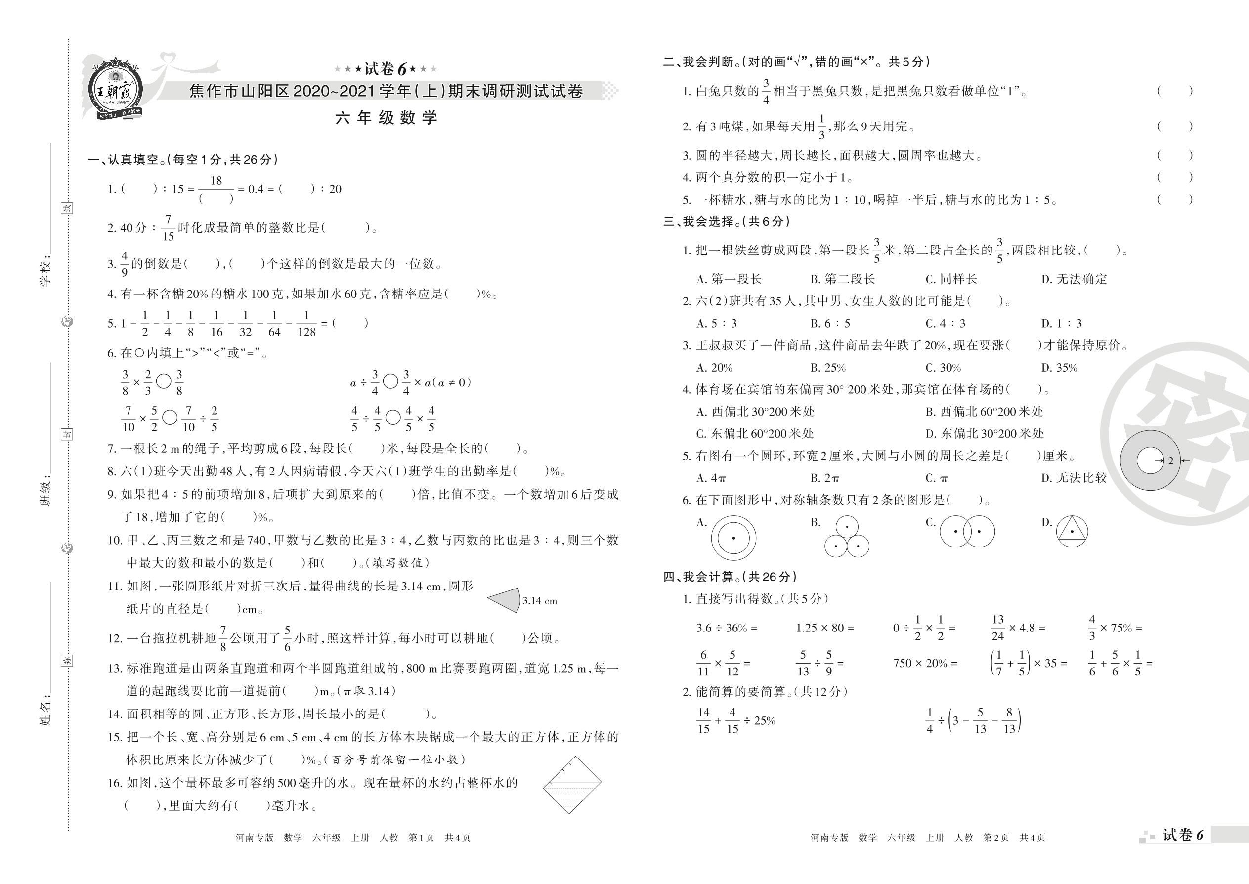 焦作市山阳区2020~2021学年(上)期末调研测试试卷六年级数学人教版【6】