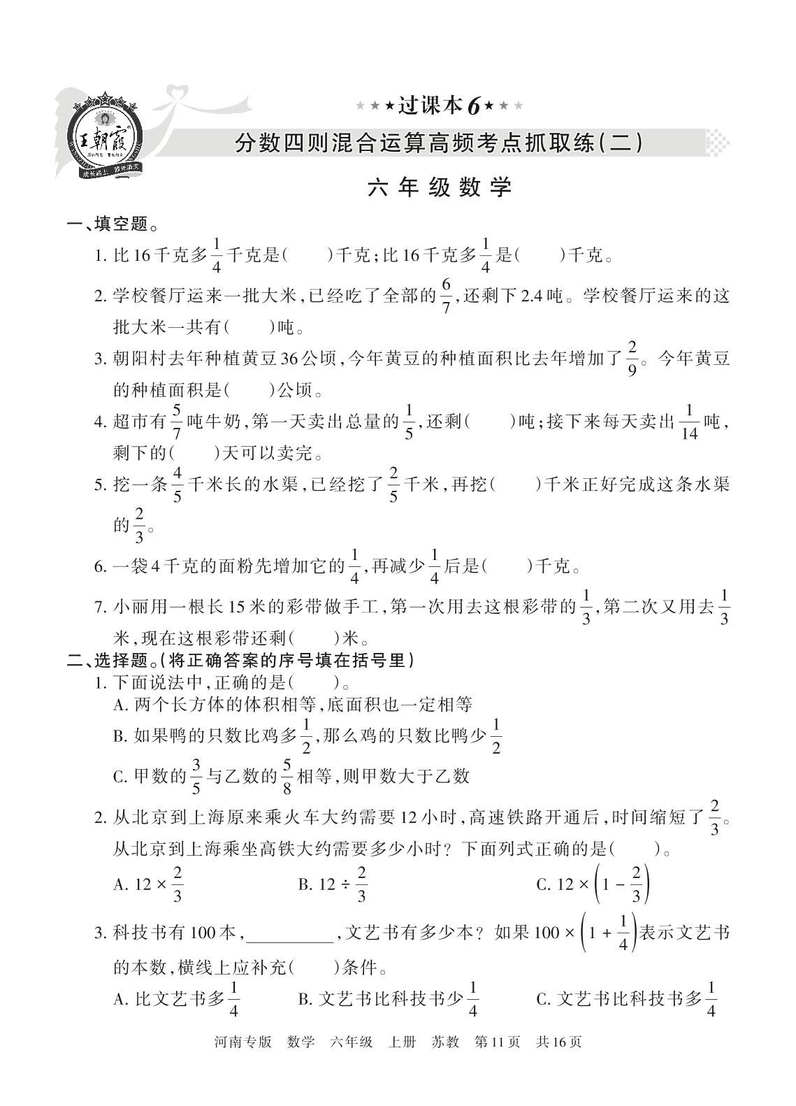 王朝霞期末过课本——分数四则混合运算高频考点抓取练(二)六年级上册数学(苏教版)_R211225162603115【6】