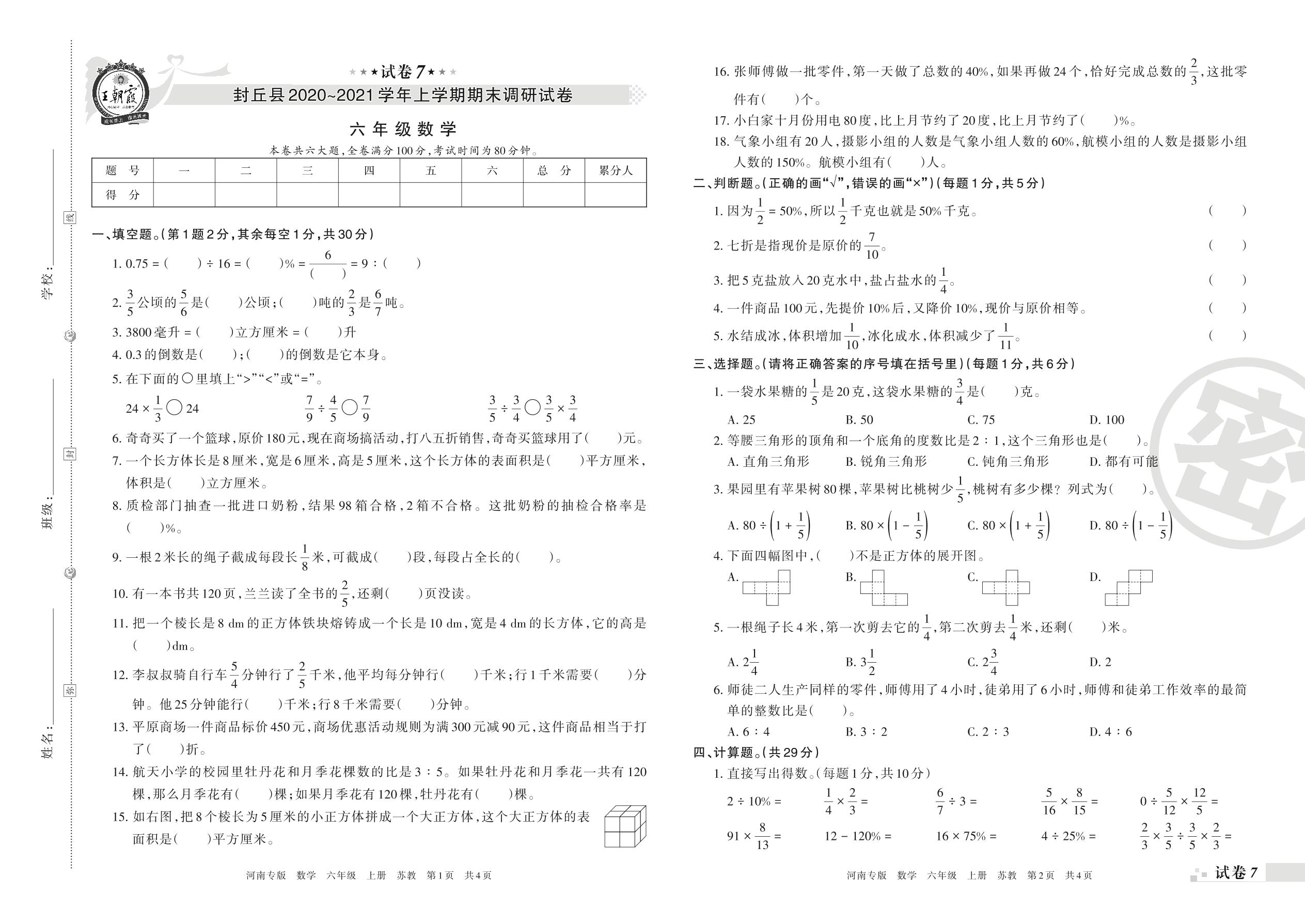 封丘县2020~2021学年上学期期末调研试卷六年级数学(苏教版)【7】