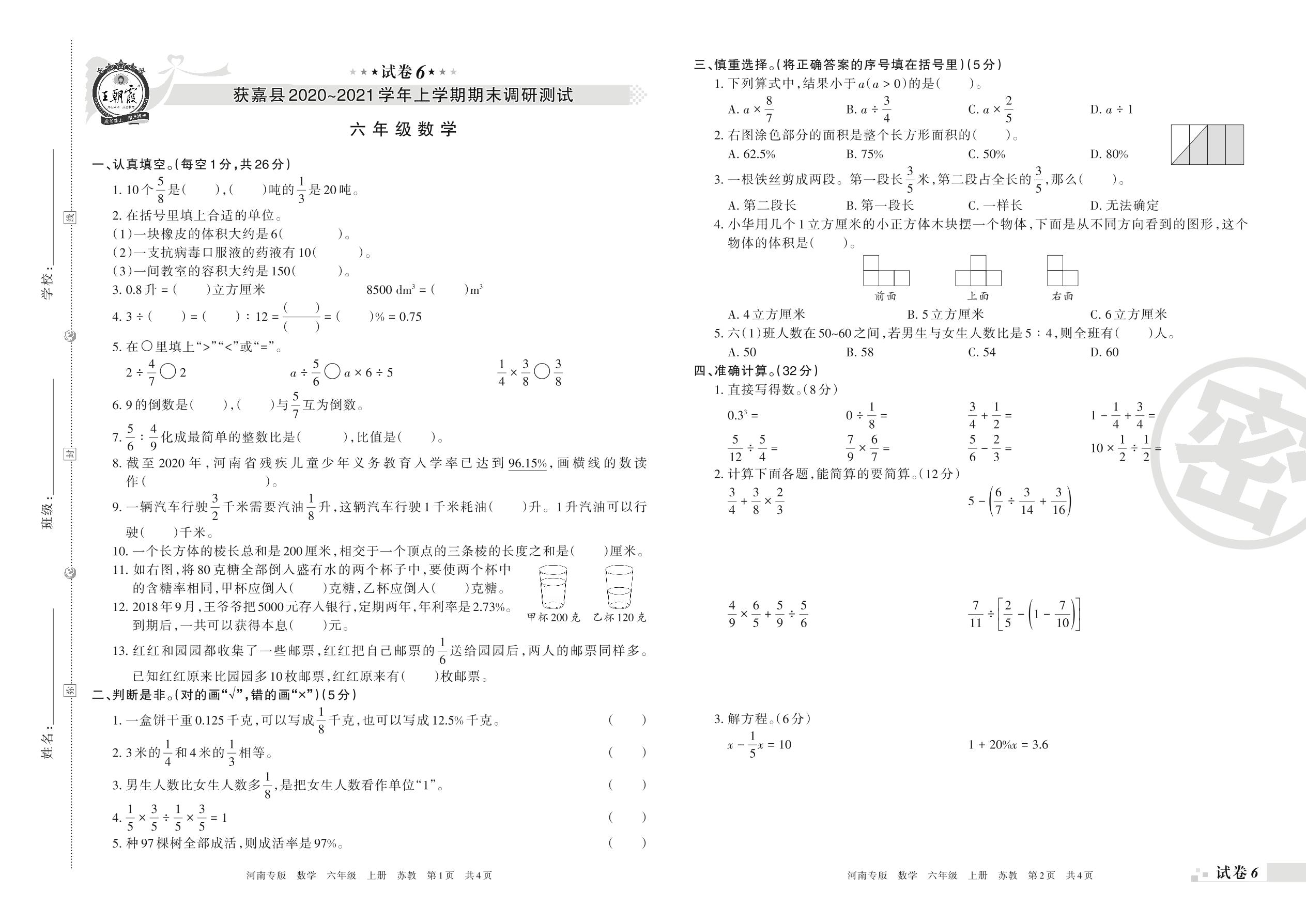 获嘉县2020~2021学年上学期期末调研测试六年级数学(苏教版)【6】
