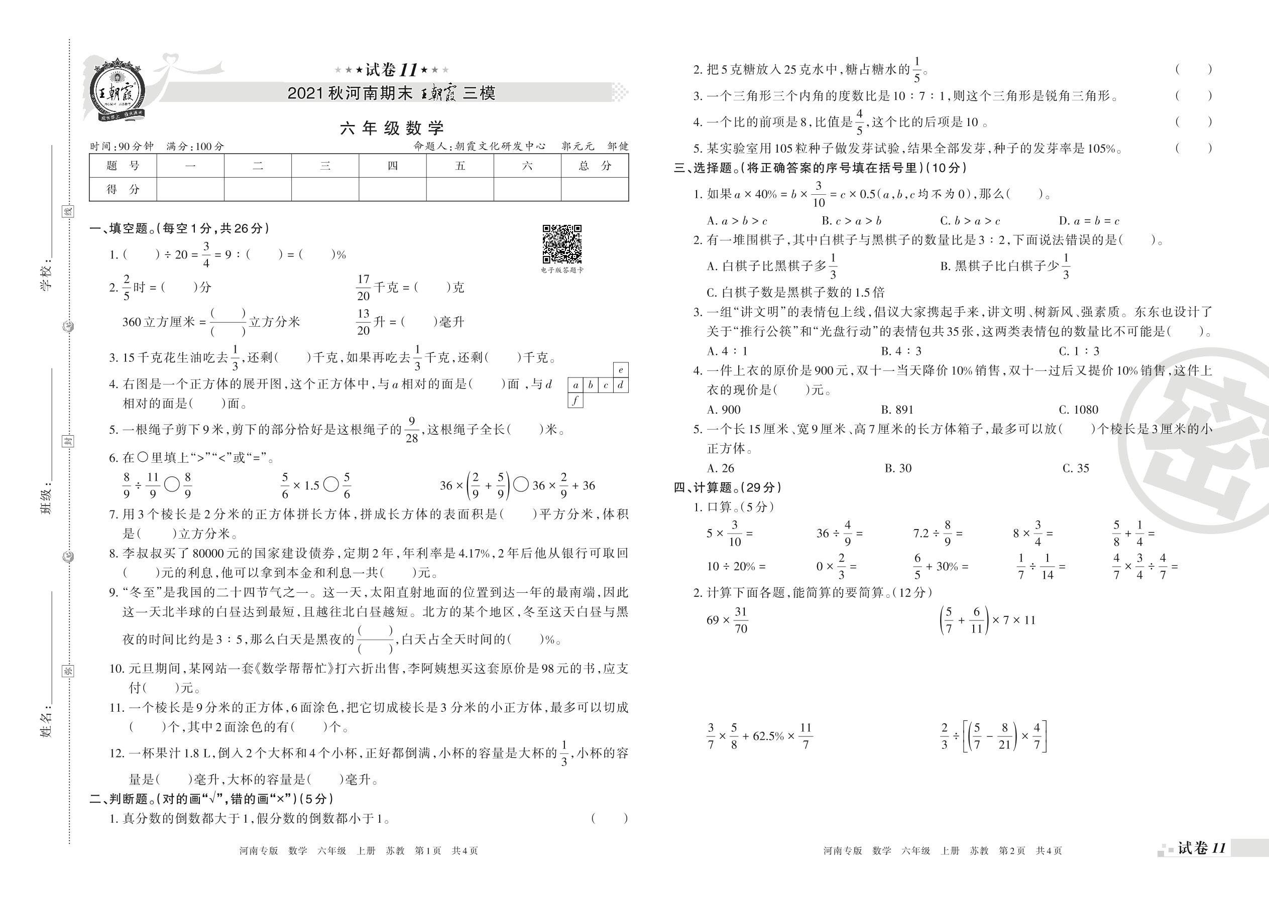 王朝霞期末模拟卷六年级上册数学(苏教版)【11】