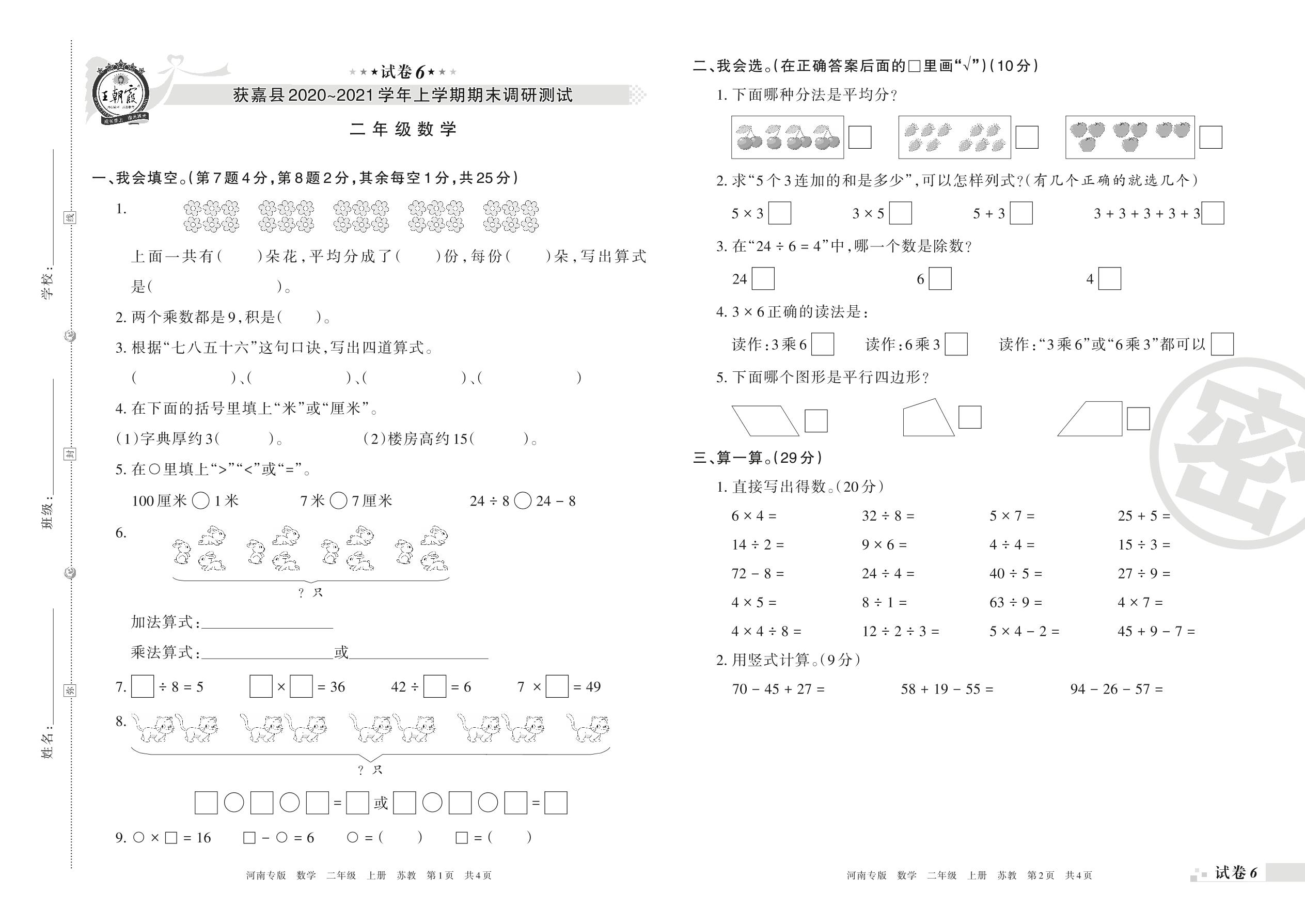 获嘉县2020~2021学年上学期期末调研测试二年级数学(苏教版)【6】
