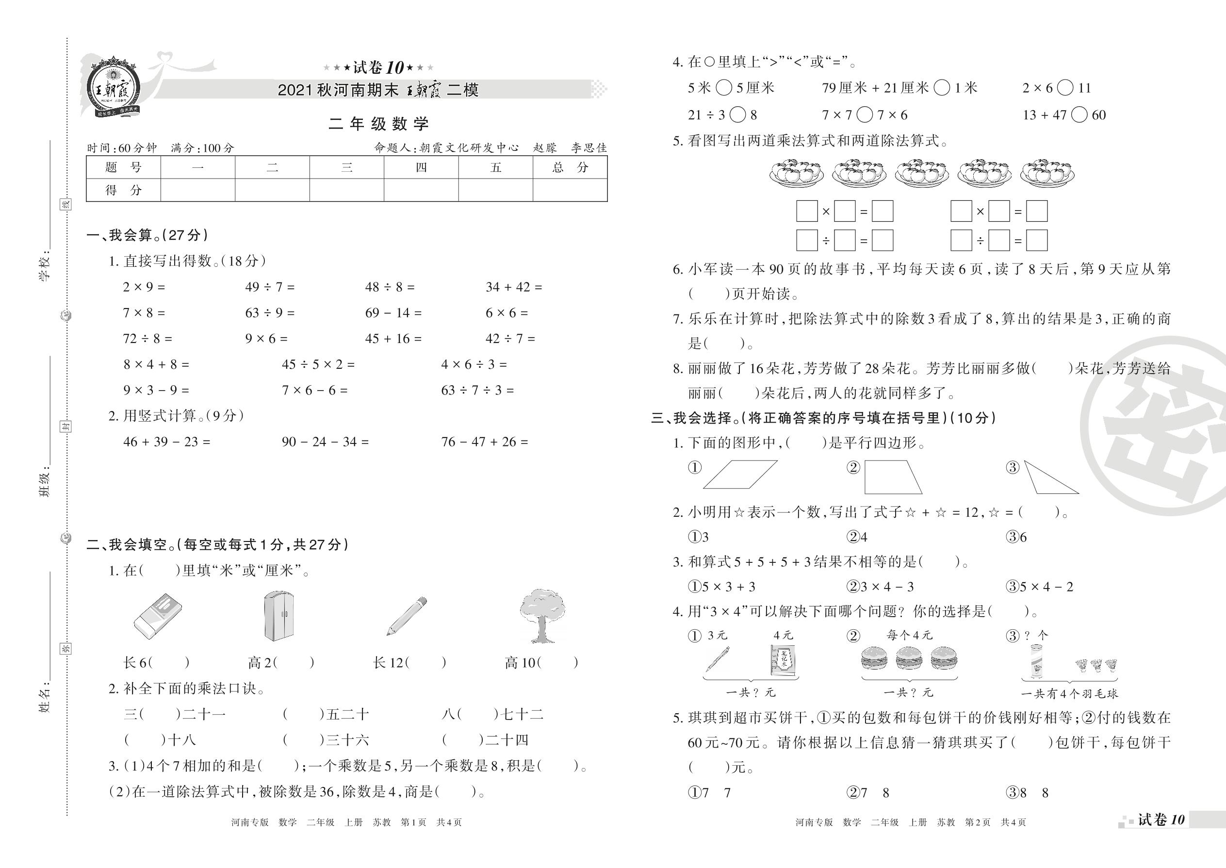 王朝霞期末模拟卷二年级上册数学(苏教版)_R211225164631783【10】