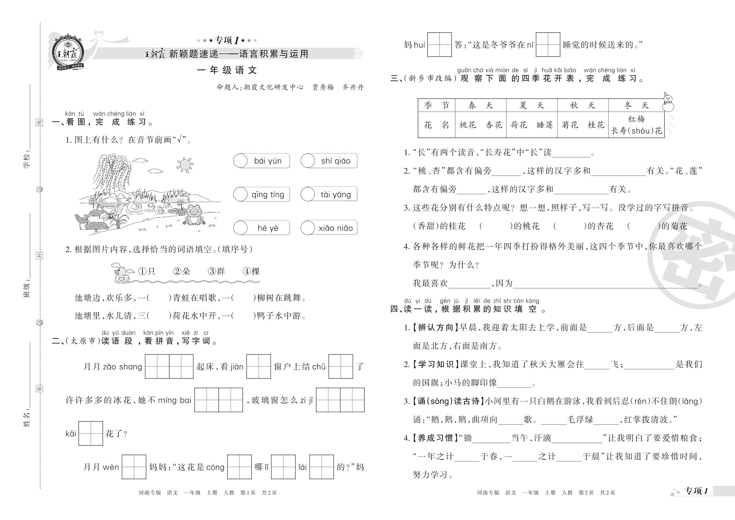 王朝霞期末专项卷——新颖题速递:语言积累与运用一年级上册语文(人教版)_R211225171037776【1】