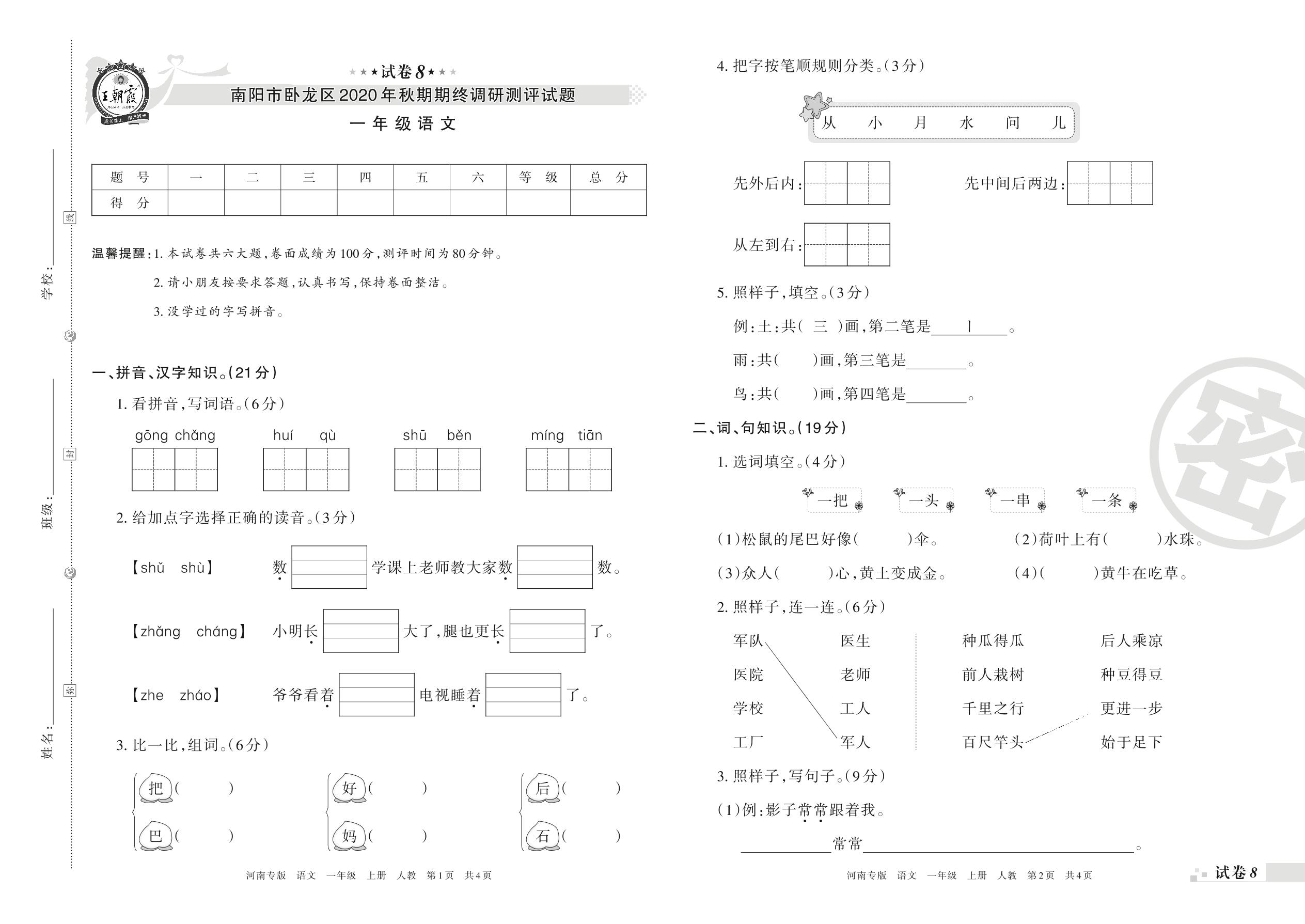 南阳市卧龙区2020年秋期期终调研测评试题一年级语文(人教版)【8】