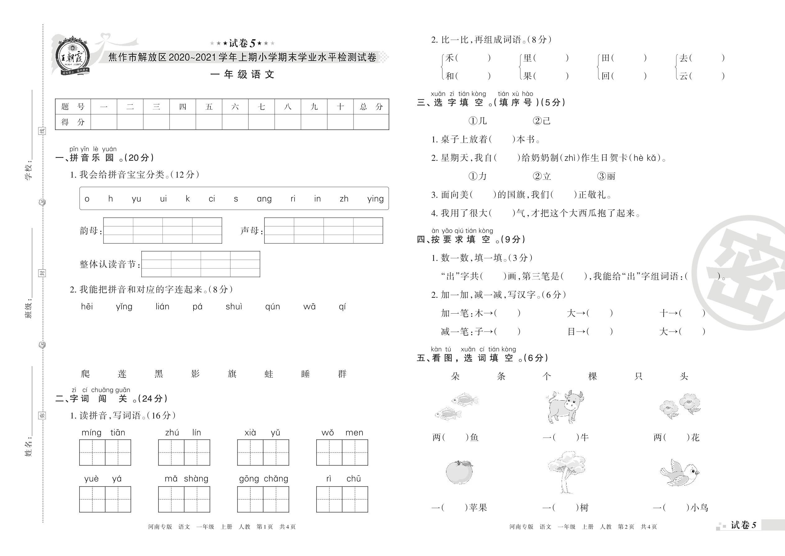 焦作市解放区2020~2021学年上期小学期末学业水平检测试卷一年级语文(人教版)【5】