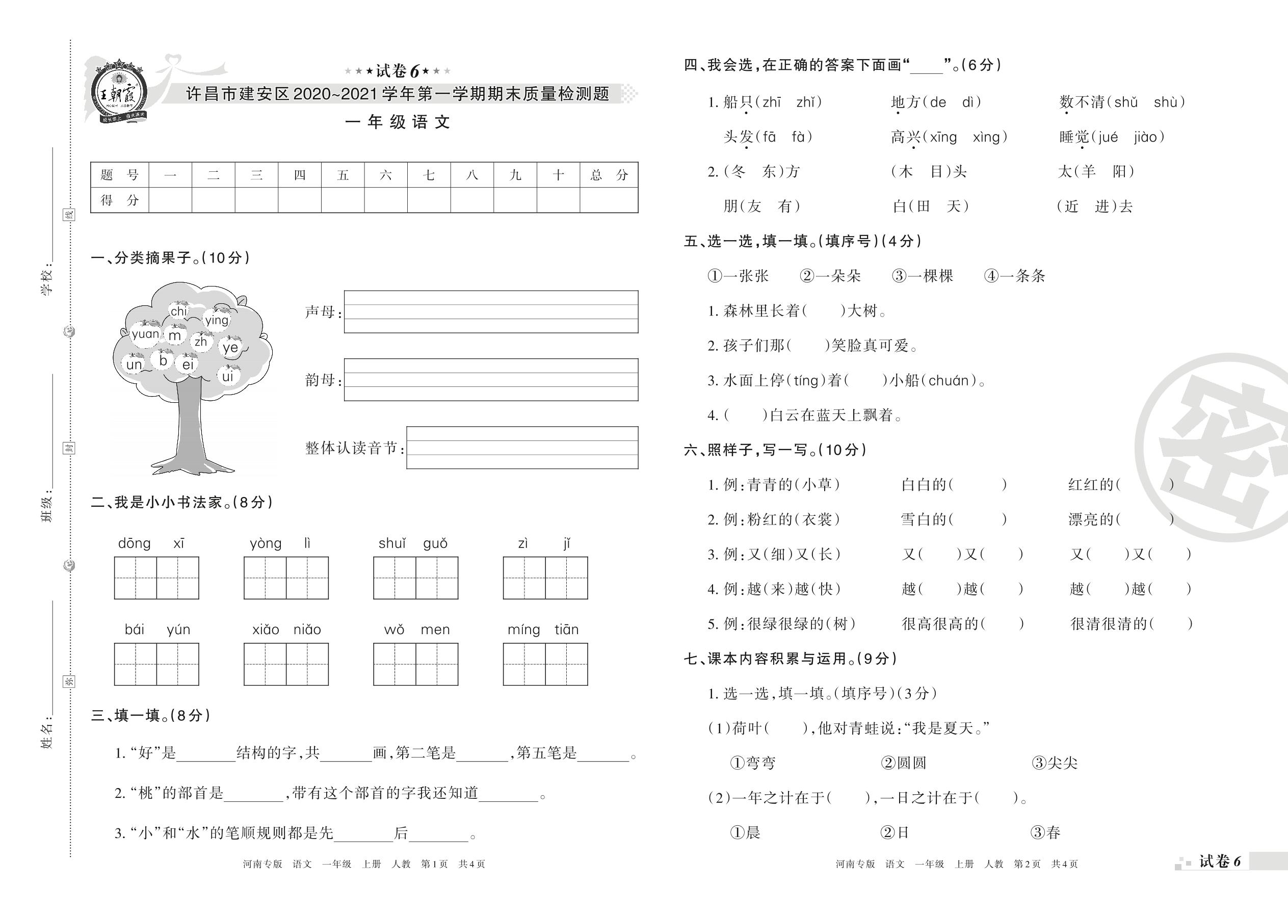 许昌市建安区2020~2021学年第一学期期末质量检测题一年级语文(人教版)【6】