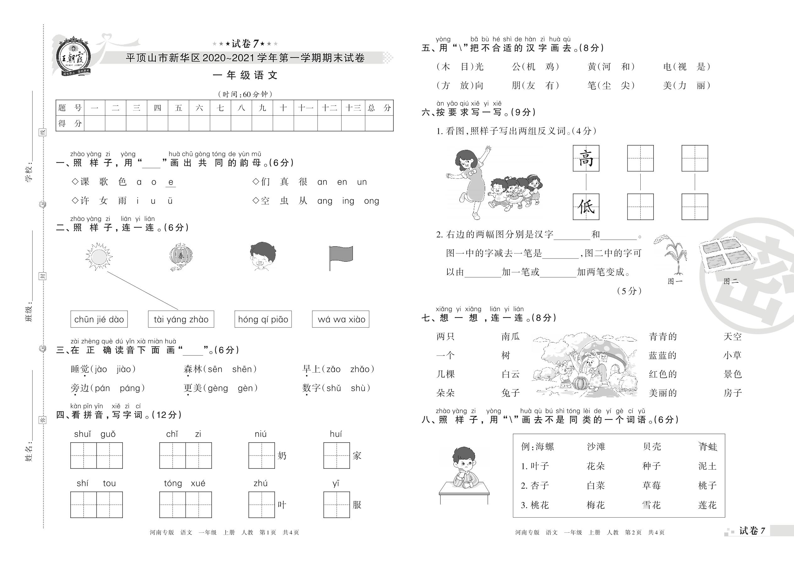 平顶山市新华区2020~2021学年第一学期期末试卷一年级语文(人教版)【7】