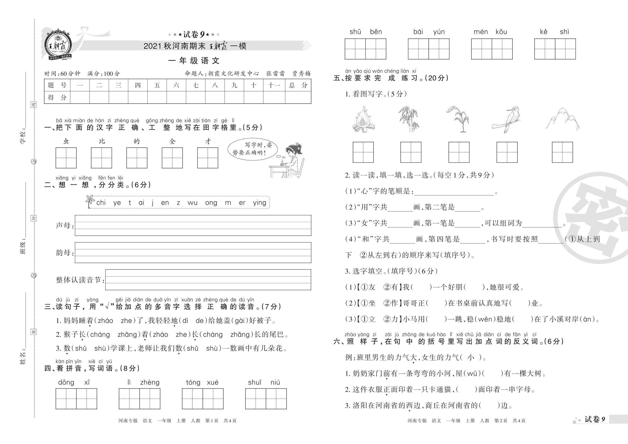 王朝霞期末模拟卷一年级上册语文(人教版)_R211225171037670【9】
