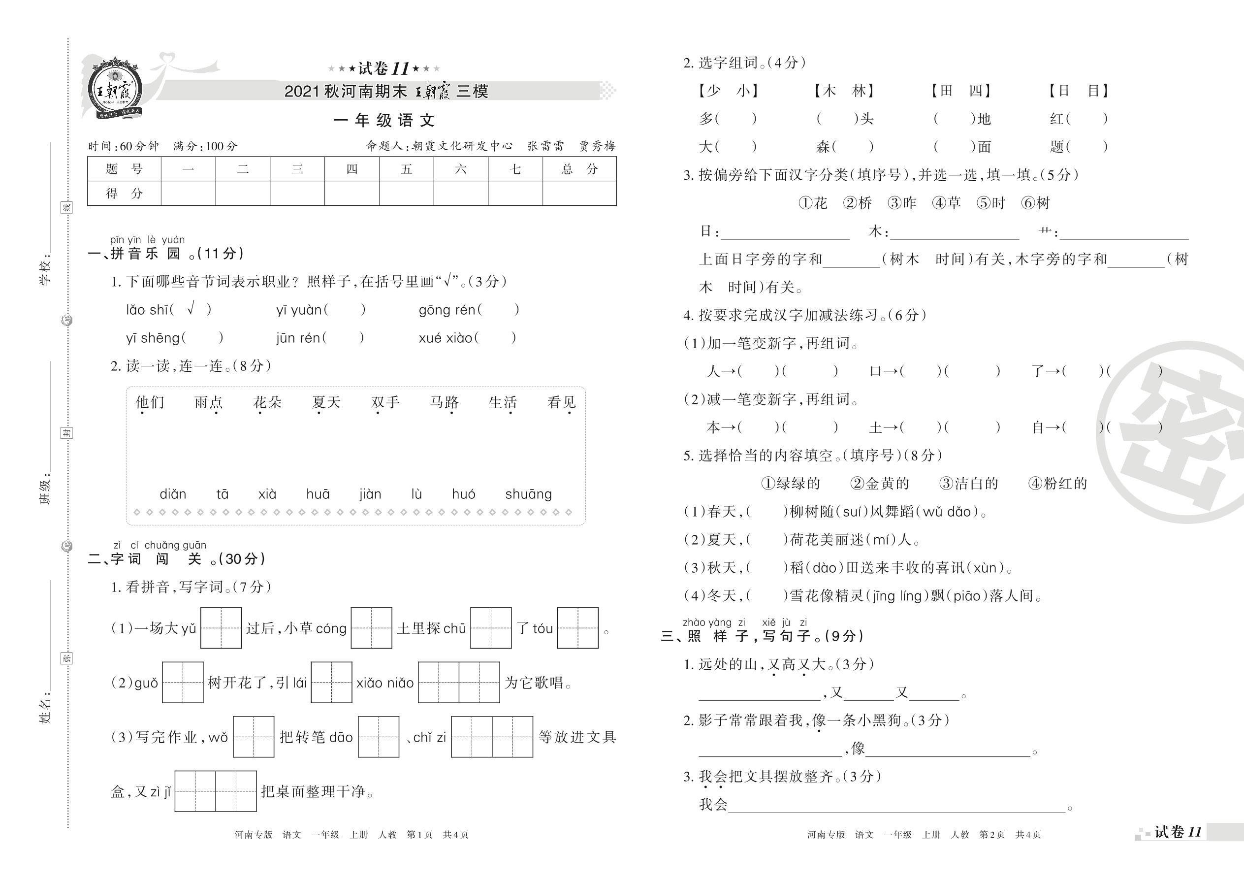 王朝霞期末模拟卷一年级上册语文(人教版)【11】