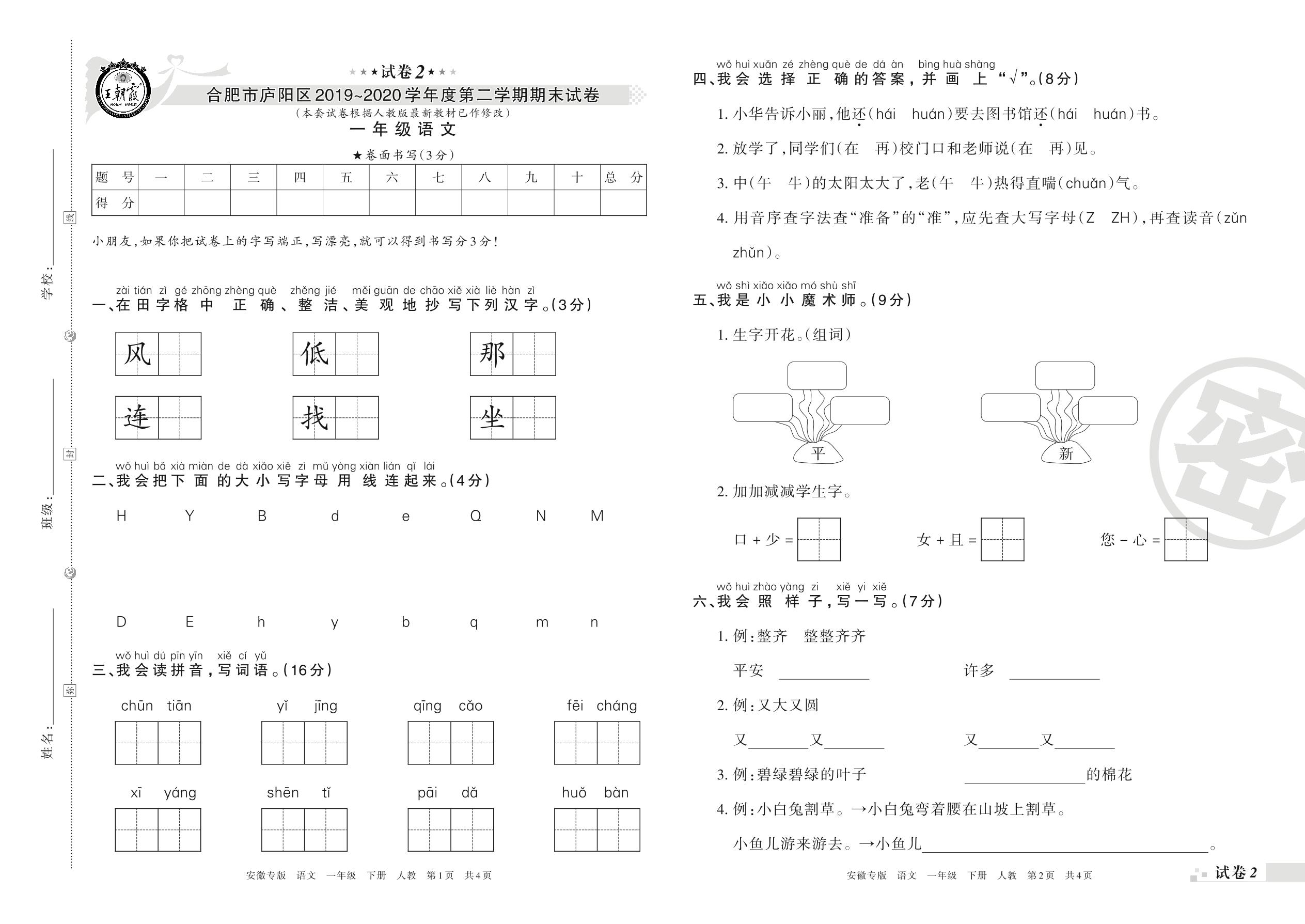 2019-2020学年第二学期合肥市庐阳区一年级语文试卷(人教版)【2】