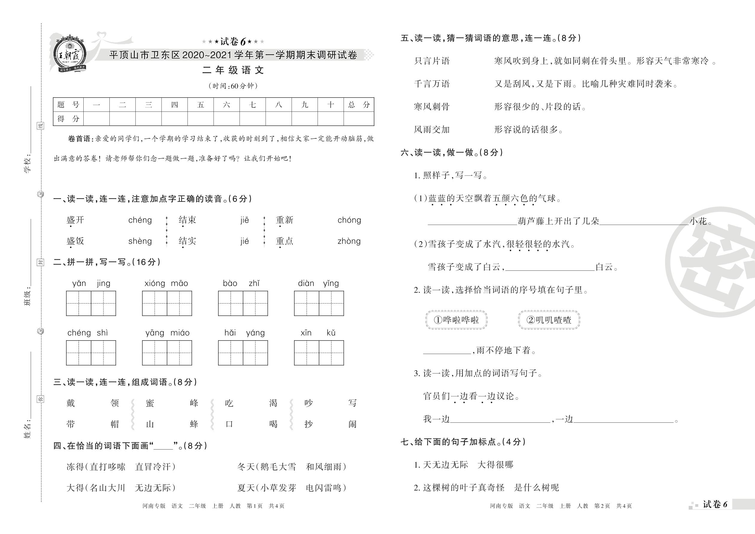 平顶山市卫东区2020~2021学年第一学期期末调研试卷二年级语文人教版【6】