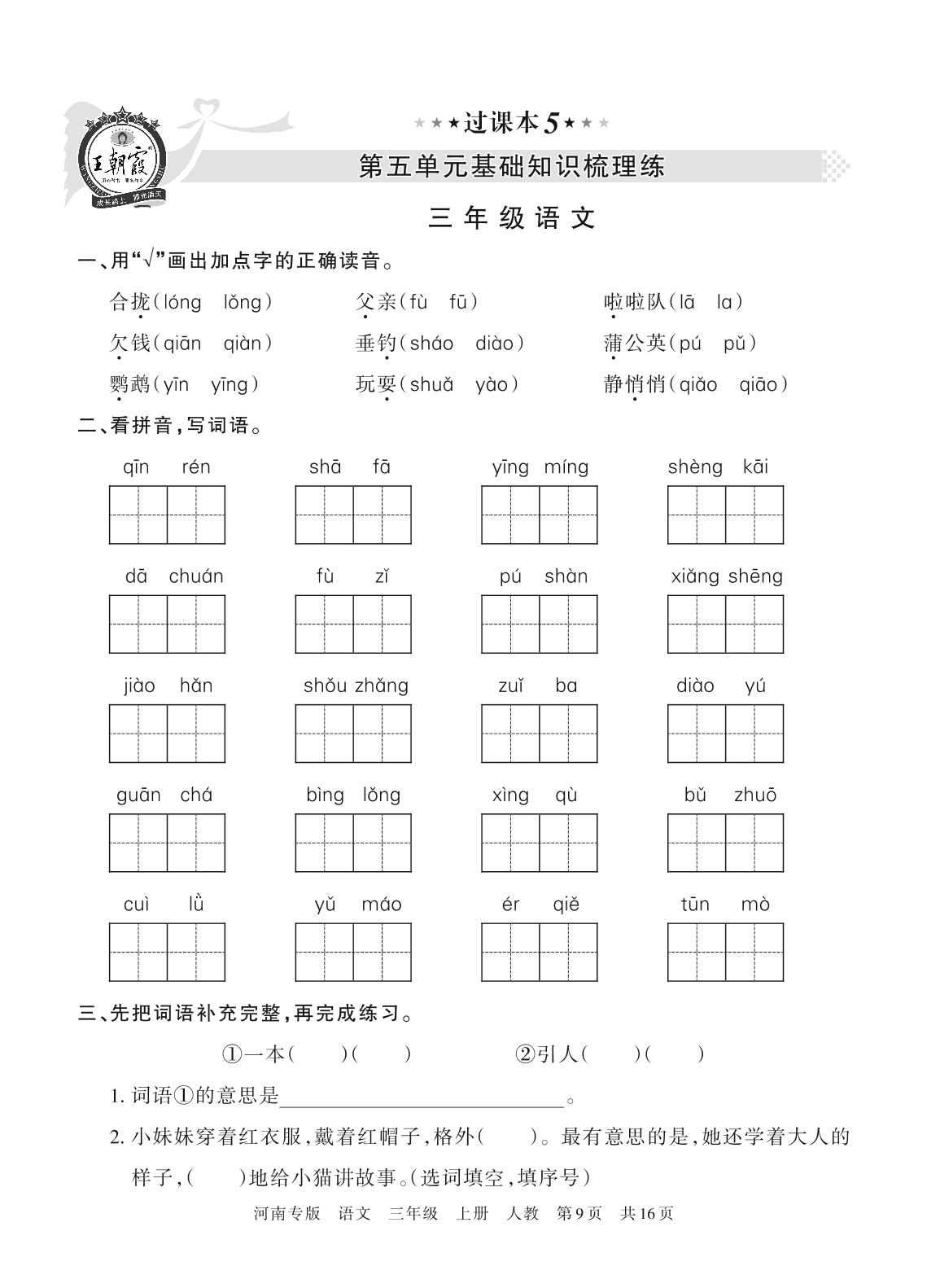 王朝霞期末过课本——第五单元基础知识梳理练三年级上册语文(人教版)_R211225172042301【5】