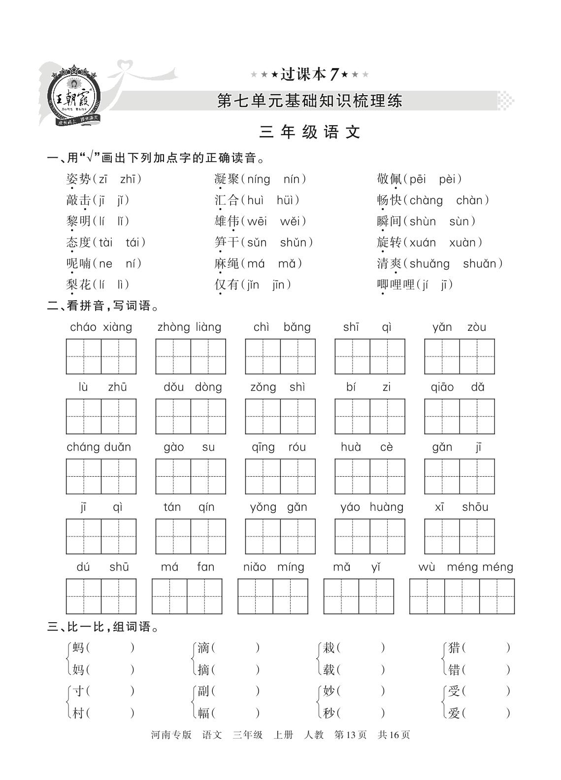 王朝霞期末过课本——第七单元基础知识梳理练三年级上册语文(人教版)_R211225172042686【7】