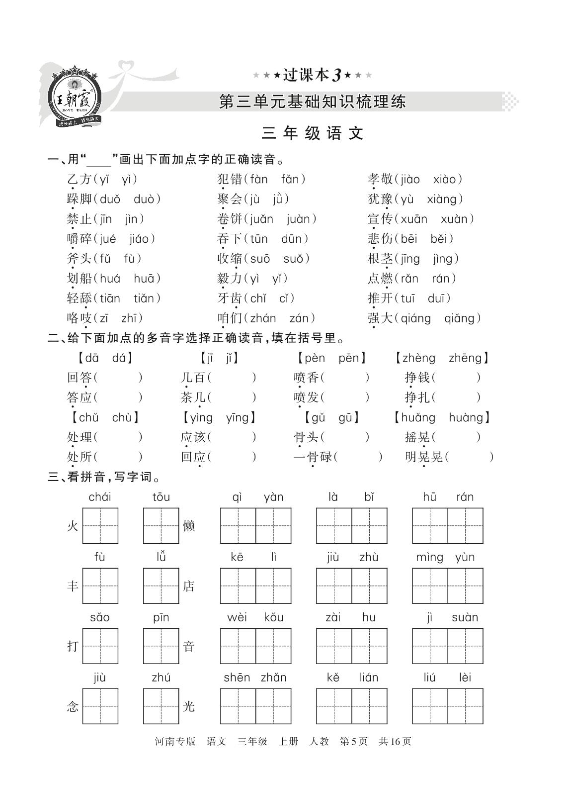 王朝霞期末过课本——第三单元基础知识梳理练三年级上册语文(人教版)_R211225172042317【3】