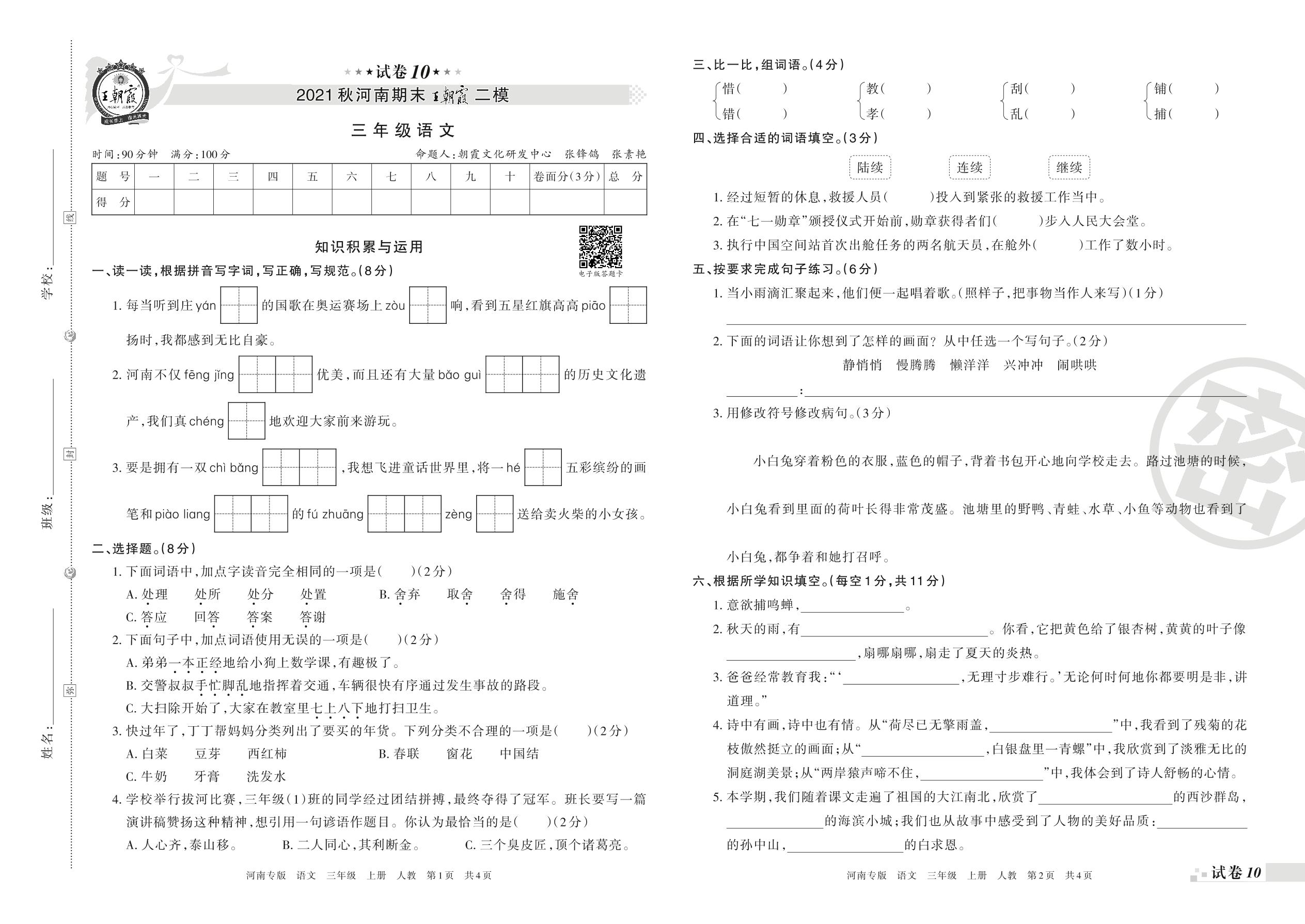 王朝霞期末模拟卷三年级上册语文(人教版)_R211225172043190【10】