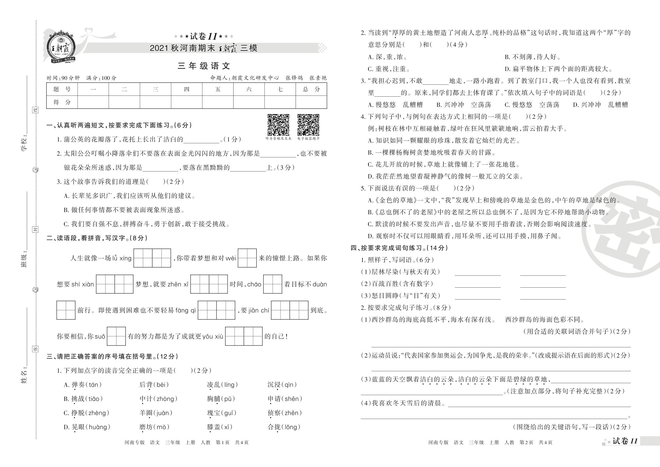 王朝霞期末模拟卷三年级上册语文(人教版)【11】